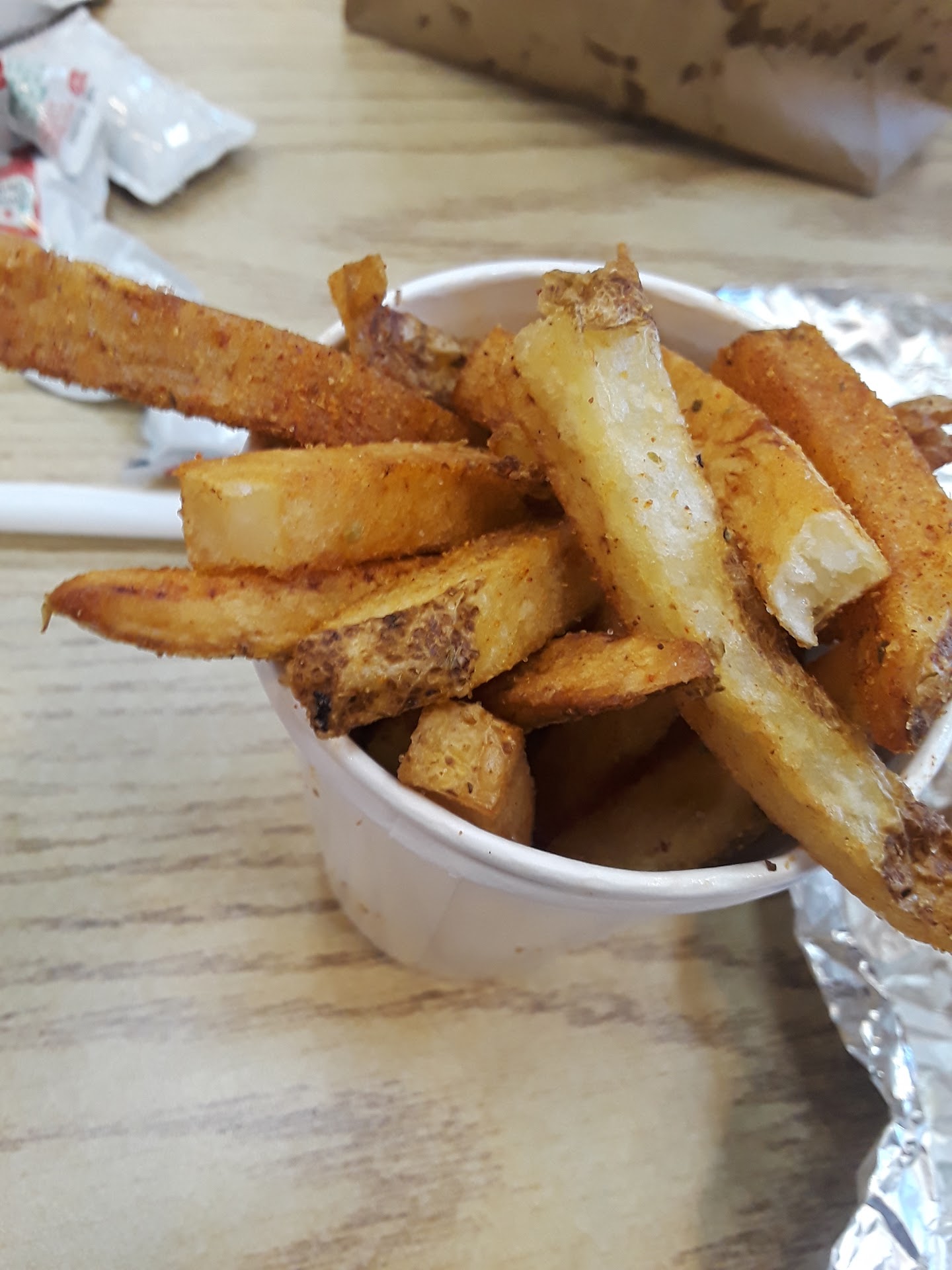 My review of the Bacon Cheeseburger matches the feelings of the Food Titan himself. The cheese oh so melted and sticks to the burger. That very super official Crispy Bacon, the condiments that magically stayed crisp and fresh vs. the soggy type of other places. Also had them Cajun Fries.... ever had a time that you bite the fry and then it bites you back? For real!!!!