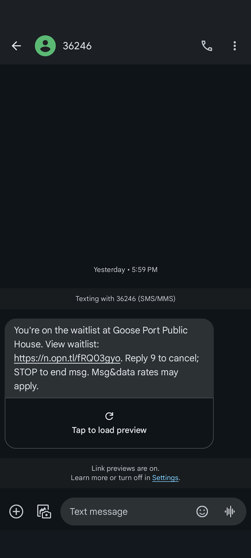 Edit: Per the request of the owner (prompt feedback is a great sign for this restaurant), the link was provided from the text message from your facility (see screenshot). I would suggest giving your staff your number and have them send you...