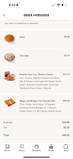 Not so great of an experience. I live close by and may give them a second chance sometime and change this review if it's earned, but based on my first experience, my family and I were very disappointed. This KFC is a 2 in 1 KFC/A&W Burger restaurant. This fact is what brought us here and should have been a major upside to my review. As I'm sure many families experience, half wanted fried chicken and half wanted burgers, so this seemed like a perfect solution for this evening.