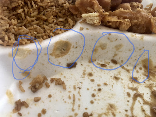 My biggest issue is that the chicken went right from the fryer into the styrofoam container, resulting in melted styrofoam, as shown in the blue circles below. Call me crazy, but I prefer not to consume melted styrofoam or to have those chemicals near my food. We’ll be looking for a new place next time we want Chinese takeout.