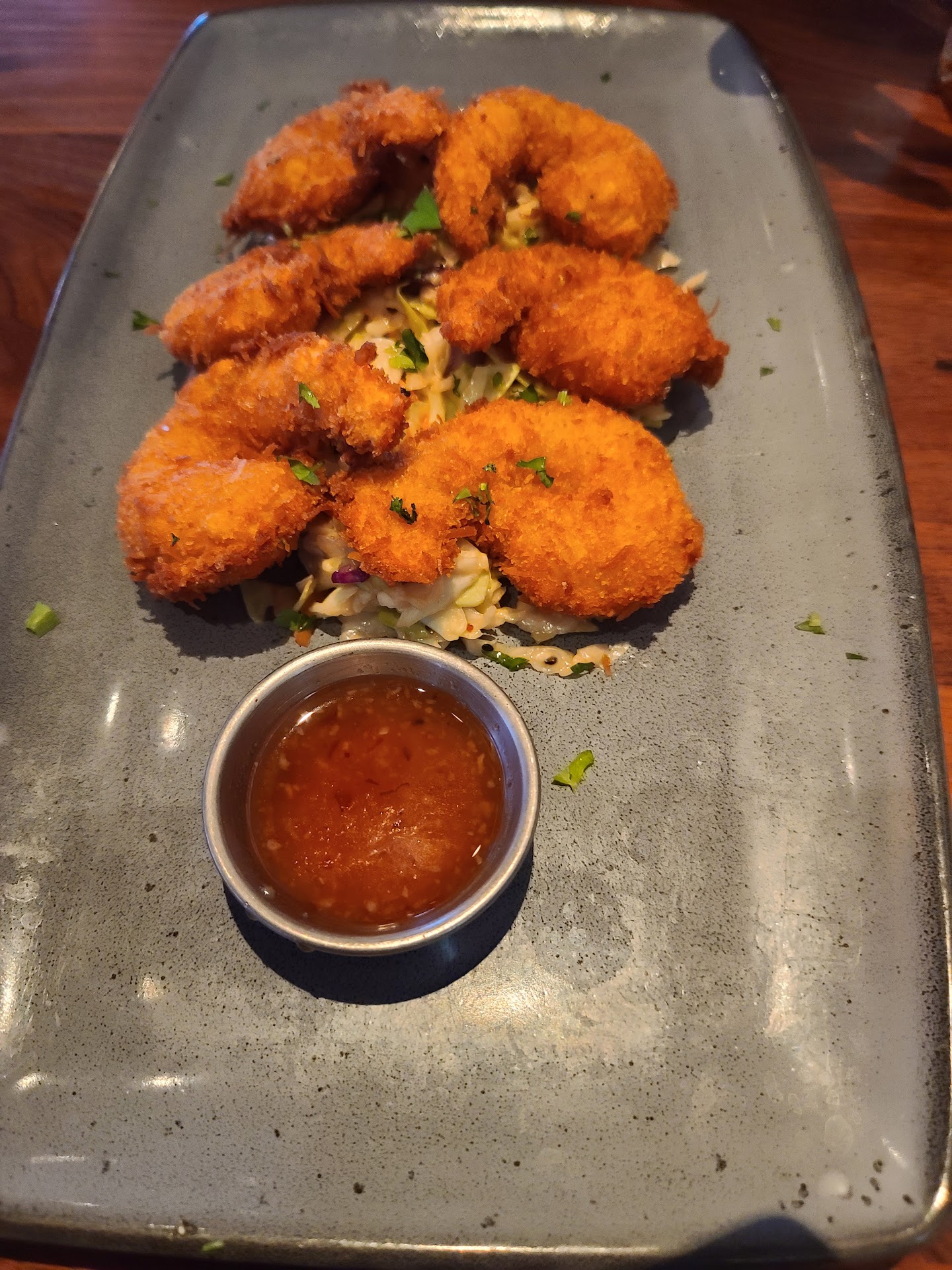 We shared the coconut shrimp appetizer...6 large shrimp come on a bed of slaw with a light Asian dressing...it also comes with a red dipping sauce which is amazing...
