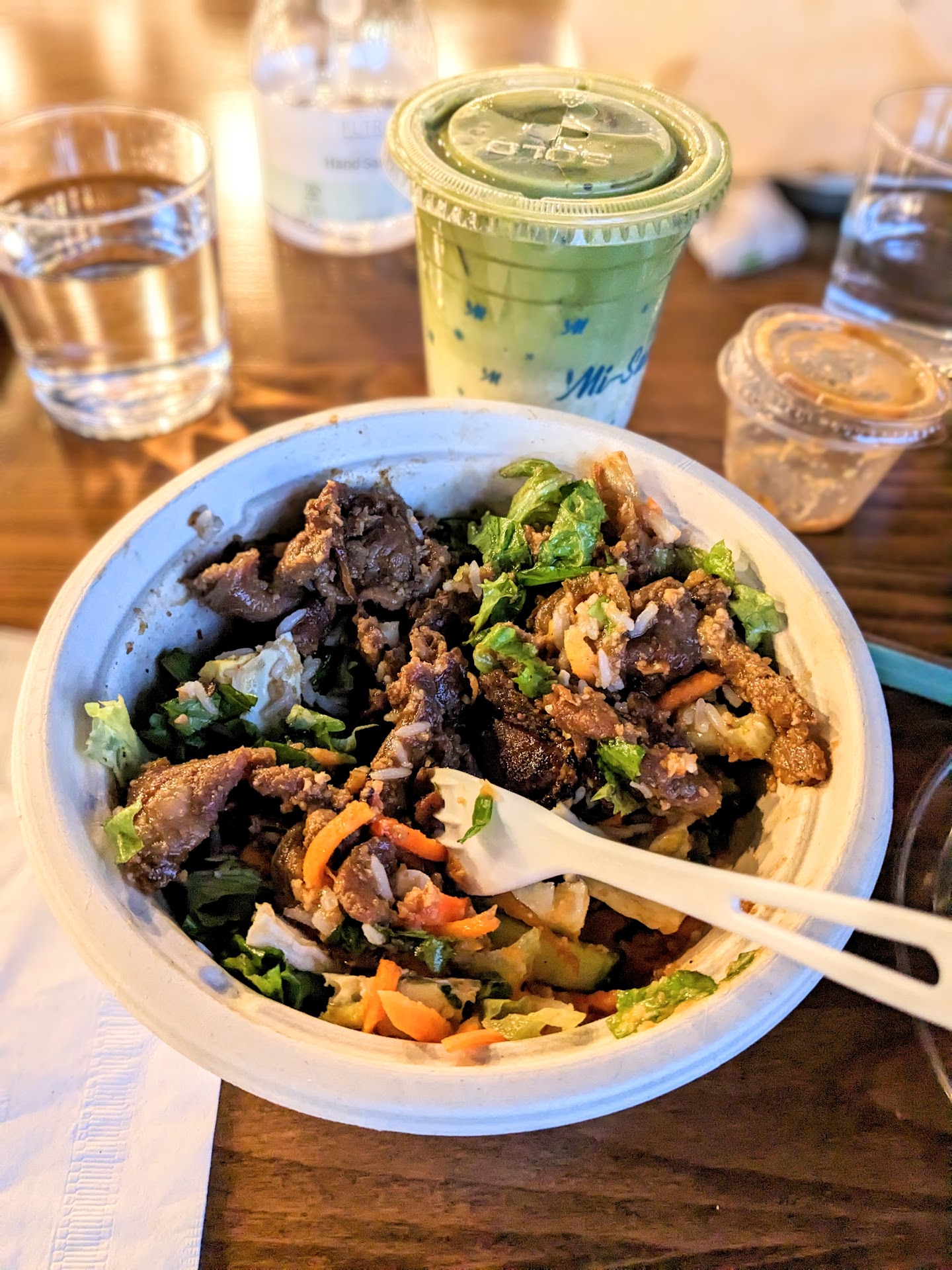 I run errands in Roseville fairly often and had recently noticed Mi-Sant while I was out and about. My husband I happened to be over that way yesterday, and decided to check it out. SO GLAD we did! Wow, this place is fantastic! We got an early dinner, and everything we tried was fantastic. I got the Mi-Sant Special bowl with rice, my husband got banh mi, and we shared an order of spring rolls. We really like Thai and Vietnamese food, and were very impressed with the freshness of the spring rolls and how flavorful they were. And the springs rolls are MASSIVE. Three of those was more than we could eat along with our meal. I've eaten at other Vietnamese places were the rice is dry and the meat is overcooked and hard to chew. But the bowl I had at Mi-Sant was fabulous - soft rice, with vegetables that were perfectly cooked, and tender flavorful meat. I was pleasantly surprised to see how much meat they add to the bowls as well. The Mi-Sant Special bowl comes with an eggroll (eaten immediately before I thought to take a picture) and an egg along with the generous serving of meat and vegetables. My husband said the banh mi he got was flavorful and very well balanced, and he said the bread had that perfect crispy outer layer with the interior staying soft. I also ordered the strawberry matcha latte and again, it was perfect. The matcha isn't overly sweetened, the strawberry puree sweetening the drink without being too sugary.