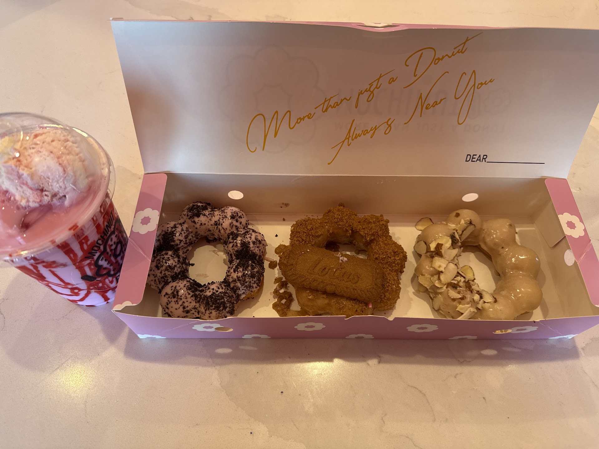 Read moreFood: I’ve always loved Mochinut’s mochi donuts so there’s no surprise here that their food quality is worth 5 stars. I got caramel almond latte, delectable matcha, and biscoff this time. The biscoff was amazing!!! 2nd in my rank would be matcha, but that’s not to say that the caramel almond latte wasn’t equally as great. I wish they weren’t that good cause I just ate too much sugar lol. It’s also my first time trying their drinks and I got the strawberry cheesecake one. It was not a smoothie texture, it’s more of an iced drink. Surprisingly it wasn’t as sweet as I expected. It’s pretty much strawberry milk with cheesecake ice cream.