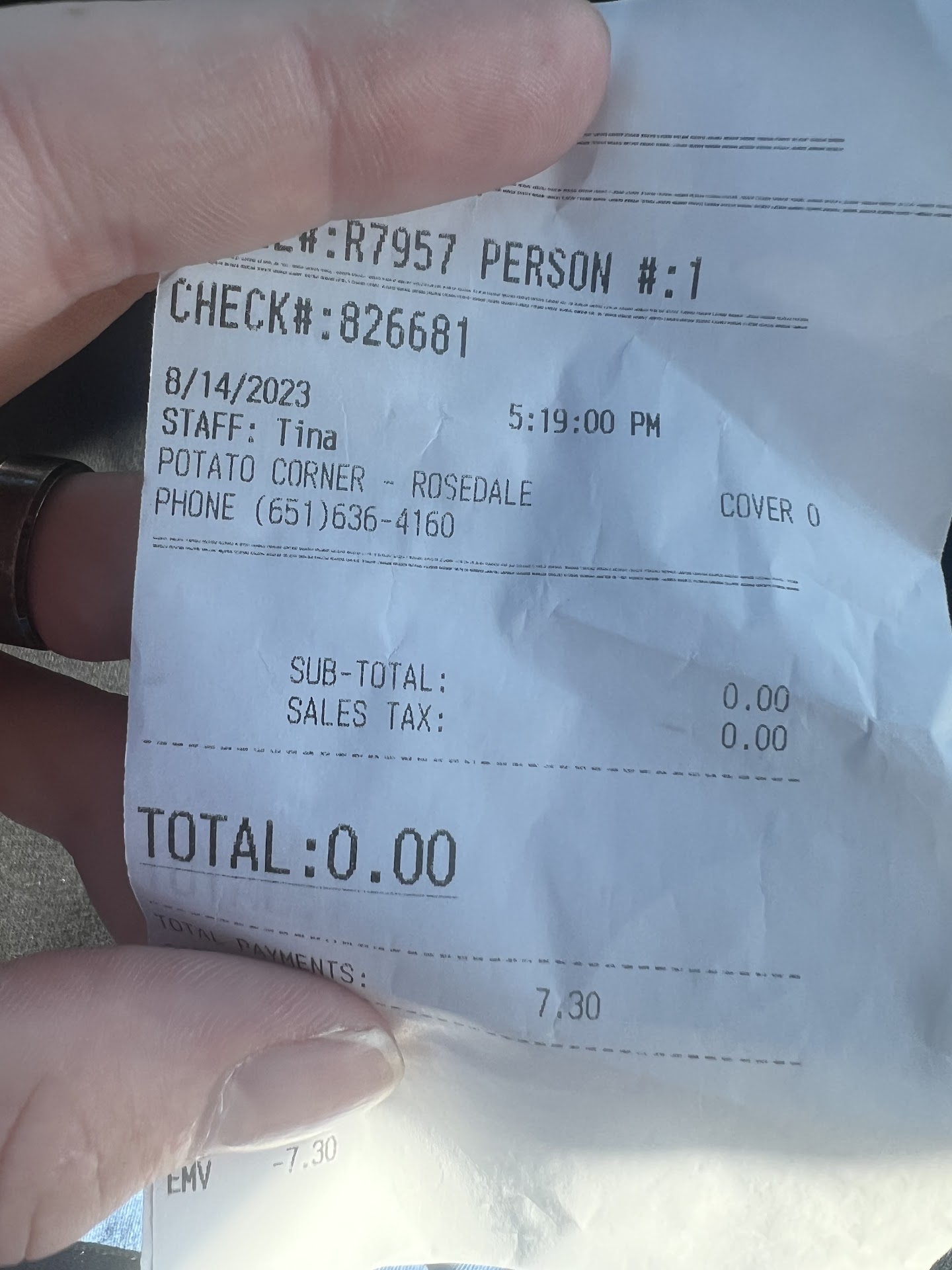 My 3 year old and I waited for 17 minutes to get an icee and fries. They called what I thought was my name and there were 2 fries orders so I assumed she rang me up for 2 orders by mistake. I should not have assumed that and it take responsibility for that.