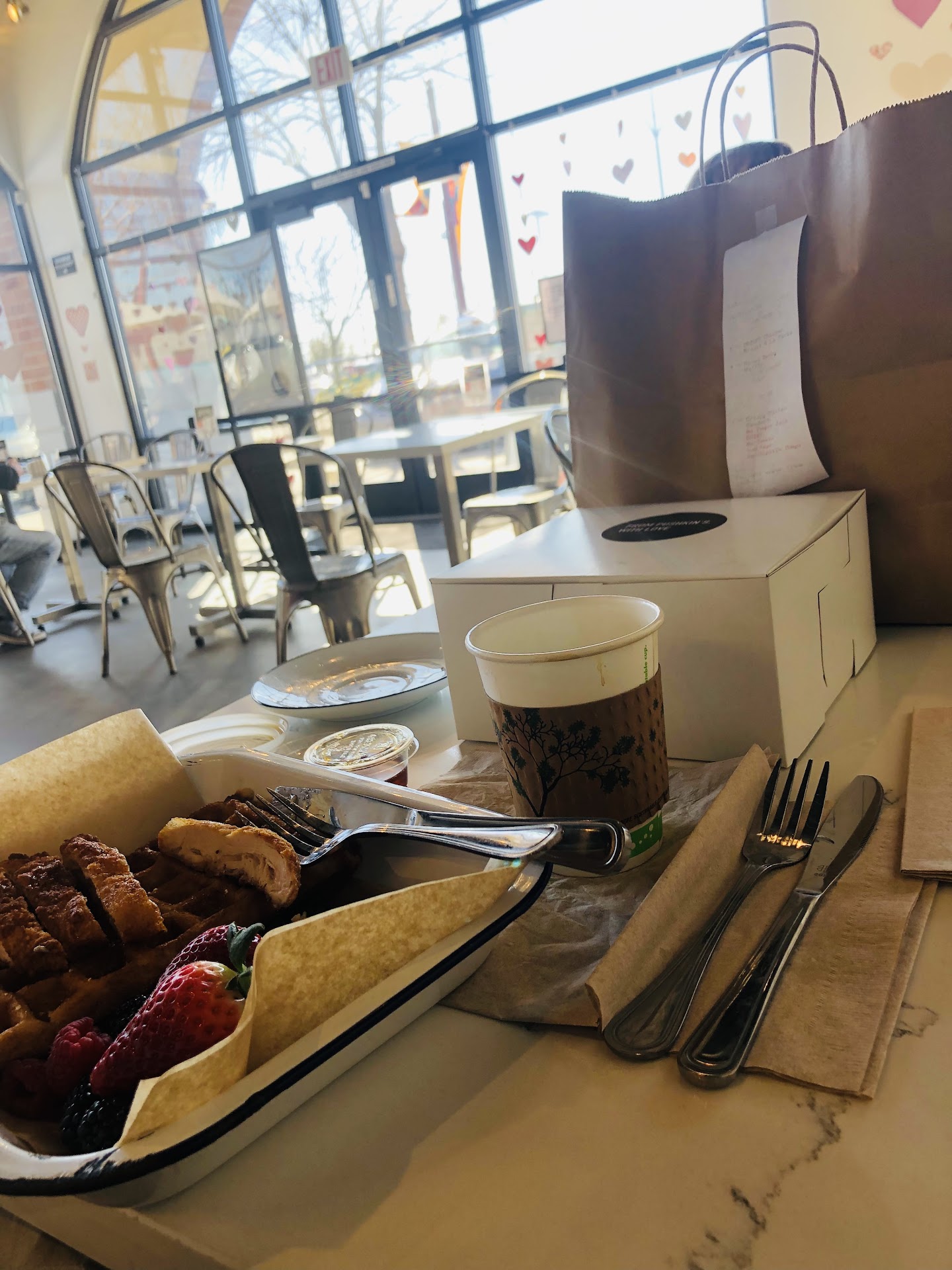 We finally place our orders, the Menu mostly consisted of Vegan options with a couple of non vegan items. We'll try, without bias and make our judgements accordingly. We ordered 4 breakfast items and I got a Lunch sandwhich (they are for the most part a La carte selections, no combo style selections that we can see. I asked if the restuarant offers a Military or Veterans Discount. The reply was NO. With our other items for the 5 of us included drinks (they service beverages in Glass cups rather than paper /plastic) had NO free refills on drinks other than water, Quiche, 2- Simple Waffles, a Breakfast Sausage and Egg) and by Turkey Bacon Sandwich along with some patries that everyone ordered, one that included my selection- Lemon Poppy Muffin. The Price point added up quickly and the total came to above $70 for the Five of us. As $70 could probably be spent in more substantial amount of food from other venues like Texas Roadhouse or similar places to that to get more bang for your buck.