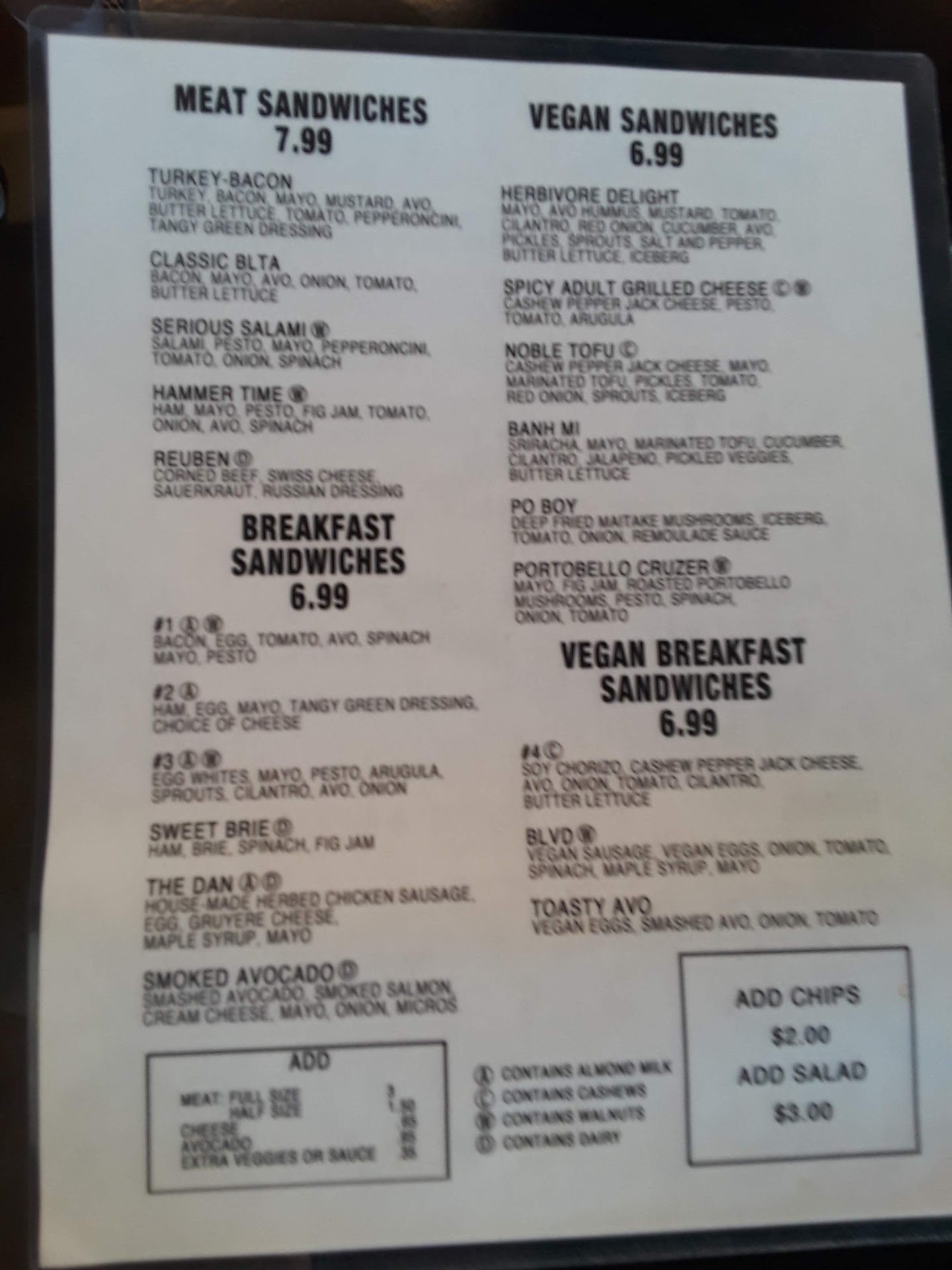 We finally place our orders, the Menu mostly consisted of Vegan options with a couple of non vegan items. We'll try, without bias and make our judgements accordingly. We ordered 4 breakfast items and I got a Lunch sandwhich (they are for the most part a La carte selections, no combo style selections that we can see. I asked if the restuarant offers a Military or Veterans Discount. The reply was NO. With our other items for the 5 of us included drinks (they service beverages in Glass cups rather than paper /plastic) had NO free refills on drinks other than water, Quiche, 2- Simple Waffles, a Breakfast Sausage and Egg) and by Turkey Bacon Sandwich along with some patries that everyone ordered, one that included my selection- Lemon Poppy Muffin. The Price point added up quickly and the total came to above $70 for the Five of us. As $70 could probably be spent in more substantial amount of food from other venues like Texas Roadhouse or similar places to that to get more bang for your buck.