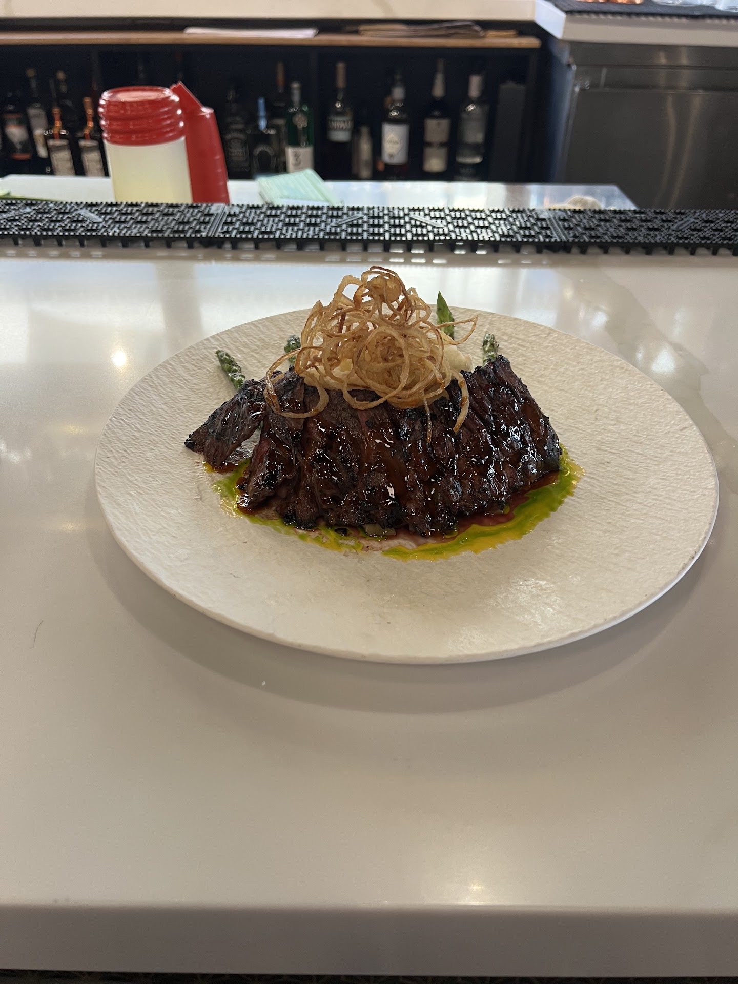 I gave a five star review but there was definitely one con that I will talk about after sharing what I liked. The esthetic is fabulous. Walking in, the decor is beautiful and pleasing. The hostess was very amiable and despite it being a Saturday and lunch time, there was no wait and she showed us directly to our table. The food was excellent - I had the mushroom risotto and my son had the teriyaki steak - both delicious. The risotto was cooked to perfection and was creamy, yet still fresh thanks to the peas, asparagus and micro greens. We had the sticky pudding for dessert which tasted good, but the sugar was still granulated (possibly the chef used turbinado sugar?) which created a texture I did not care for, but my son ate the whole thing, so still a win. Our server Brittany was a super star despite being super in the weeds thanks to bad management. And here is what really bothered me about my visit. It was a Saturday at lunchtime. There was a large 50th birthday party in the private room full of ladies who were clearly ready to enjoy some cocktails. Our server, Brittany, was not only serving, but also the lone bartender. Meanwhile, the manager was walking around doing absolutely NOTHING! And despite being super in the weeds, Britanny managed to make massive amounts of cocktails AND not drop the ball on service to our table. The manager should be fired. He should have properly staffed the restaurant for the large birthday party and a Saturday lunch. If people called in sick, he should have promoted a busser (there were plenty) to server to help out. He should have jumped in as a server to help out. He should have jumped in and at least poured beer and wine to help out. He should have done ANYTHING to help out. But he was just dead weight. Walking around doing nothing while his bartender was struggling to keep up with orders. The manager didn't even come over to our table to check in (which was something I often did as manager if I had free time - customer feedback is super important!) And, having been a manager myself, bad management really sticks in my craw. You can tell when it is the staff and when it is the fault of management. Which is why I still left an excellent review because the staff and the chef are fantastic, and I will be back again. So, to the owners, whoever was working as manager on October 19th, lunchtime, you should fire him. Get someone in there who knows what they are doing so your amazing staff can have the support...