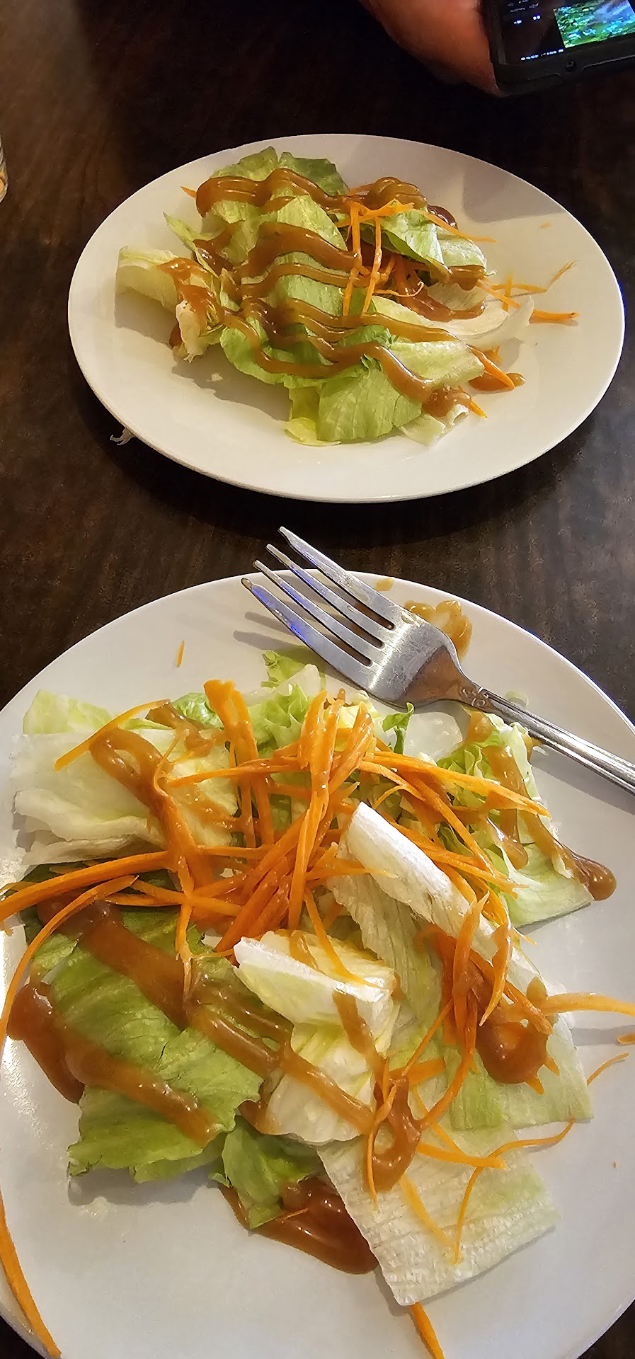 The Chicken Pad Thai was sweet and greasy, maybe had one green onion on the plate and didn't have cilantro or lime wedges. Flavor was ok but definitely was missing those side items. We did ask for some lime wedges on the side and that helped a bit.