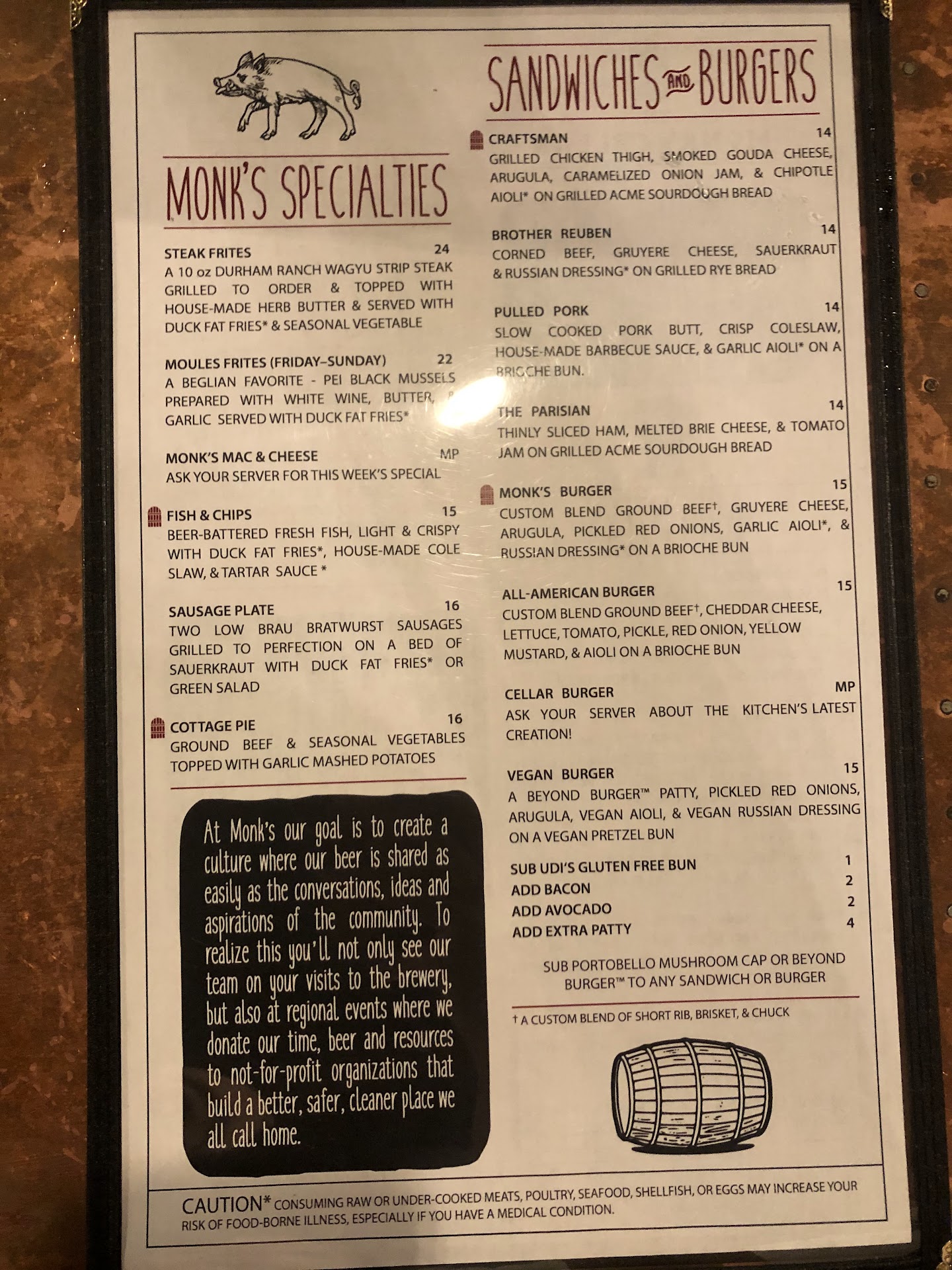 The last time I came to the monks cellar I walked through the front door, it wasn’t busy at all, the greeters were happily chatting to them selves, didn’t break to acknowledge my presence until they decided they were done chatting. Of course I didn’t interrupt, because I felt it would be disrespectful. Once they were done chatting they then acknowledged me and brought me and my girlfriend to a table right next to the door of the managers office. Great. Our waiter came, took orders for our drinks, and brought them to us. Nothing out of the ordinary. He took our orders and even made a recommendation which I greatly appreciated! Once he left that’s when a few things of which I did not appreciate happened. A staffed member had to enter the managers office or supply room of some sort, of which the door to enter was directly behind my chair, forcing me to move forward and awkwardly apologized for being in the way. After that, our food came! It was awesome and great! We weren’t interrupted again until the same staff member who entered the supply room/managers office decided it was appropriate to place a chair that had “gone missing” at our table, interrupting my girlfriend, and I. Once we had finished eating I called to get the check, I handed my waiter my card, he came back for me to sign, the pen he gave me had no ink. I had to flag down someone else to ask for another pen. I normally give very very generous tips, but this time I did not.
