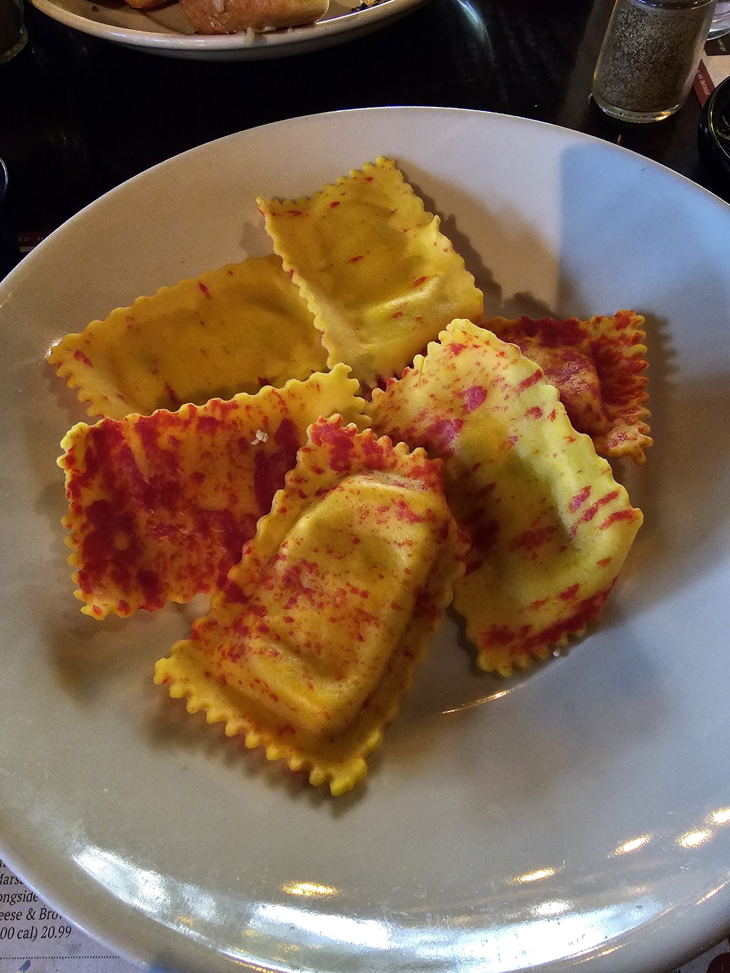 Once seated, things actually moved fairly quickly. My party and I were given menus; at least OSF is still doing physical menus rather than looking on a phone. We all wanted iced waters and as for my drink of choice, I decided on a carafe of their "Chianti" Tuscany, Italy wine. As far my meal of choice, I settled with an OSF favorite of mine, the "Pot Pourri". This was their 3-pasta sampler that included Mizithra cheese & browned butter, meat, and clam/marinara sauces. And of course every meal includes an appetizer that includes warm fresh bread & butter and a house salad.