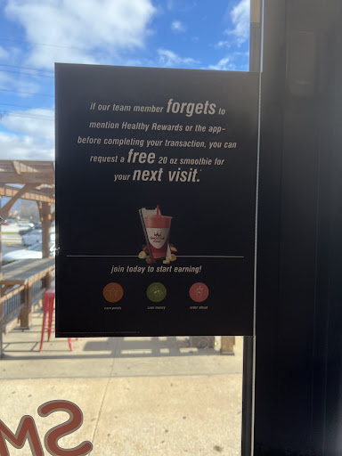 While waiting we saw the sign on the door stating; if you we donāt mention the rewards program then you get a free drink. I asked the customer service lady why didnāt we get a free smoothie and she responded no very disrespectfully. She said we talked about it. I said no I asked you about it and she became argumentative. So she was offended that I asked her about something that she still failed to explain adequately.