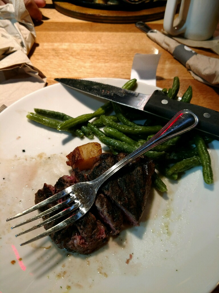 While we waited for the spoon, we began working on our meals. The childâs meal came out hot. Everything was as ordered. My husbandâs hamburger came out loaded despite the request for some veggies to be held off, which was an unpleasant surprise when he bit into it. The fries with his meal were fine. The steak I received was warm (not hot whatsoever)- half of it was over-cooked, half undercooked. The pasta tasted like a loaded baked potato and was hot in some places and cool on others. The baked potato was a hot mess. Actually, nothing about it was hot. Instead, it was cold and hard as a rock. I had to use a steak knife just to try to cut the inside and mix the âfixingsâ in. The butter was solid- which should have been a red flag in itself. It wasnât edible.