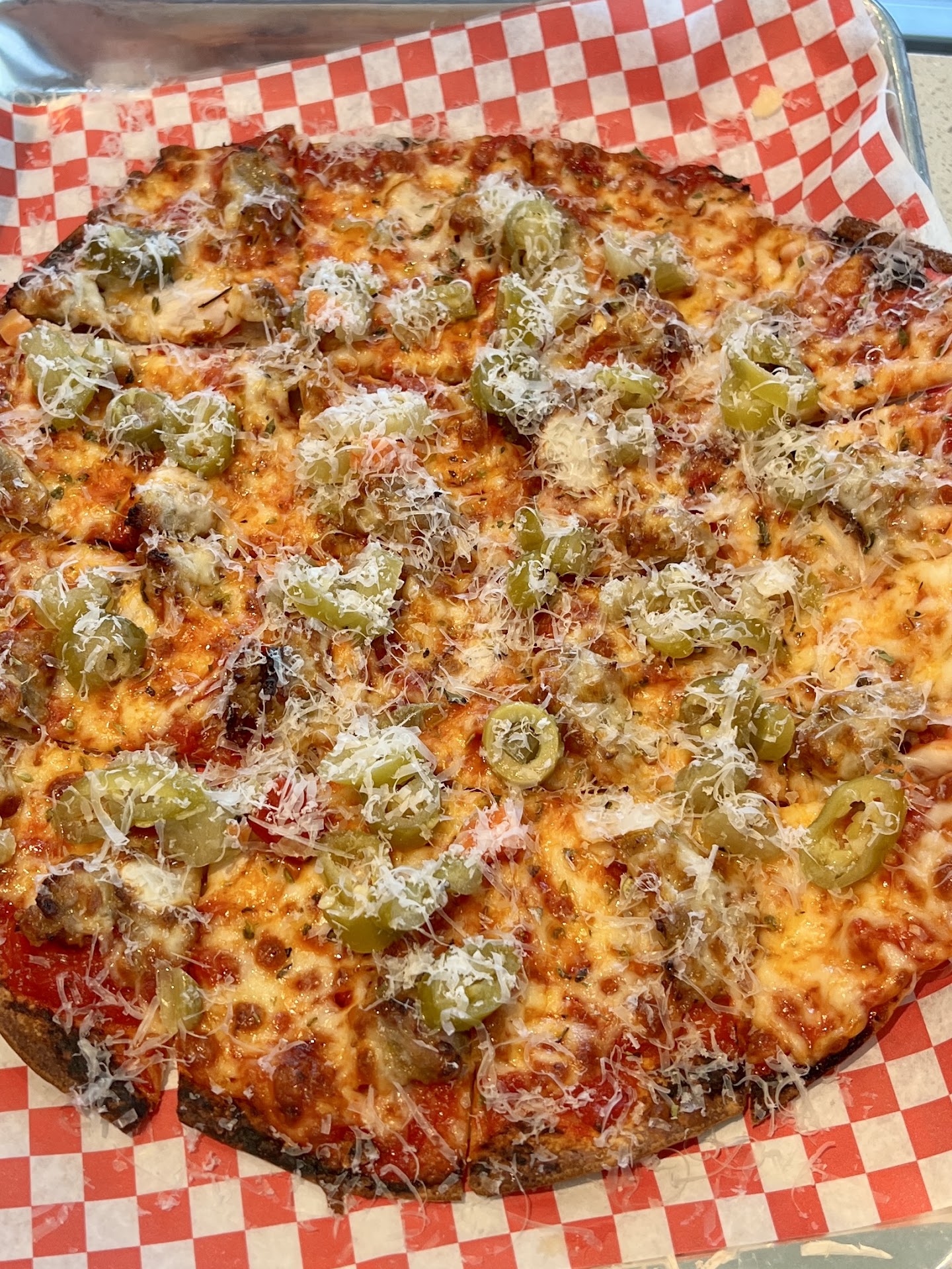 The crust is ultra-thin, shatteringly crisp, and beautifully golden, just like the best tavern-style pizzas in Chicago. The toppings are generous but donāt overwhelm the crust, and the cheese has that perfect pull with just a little caramelized edge action. And letās talk about the square-cut slicesābecause we all know thatās the only way to do it right!