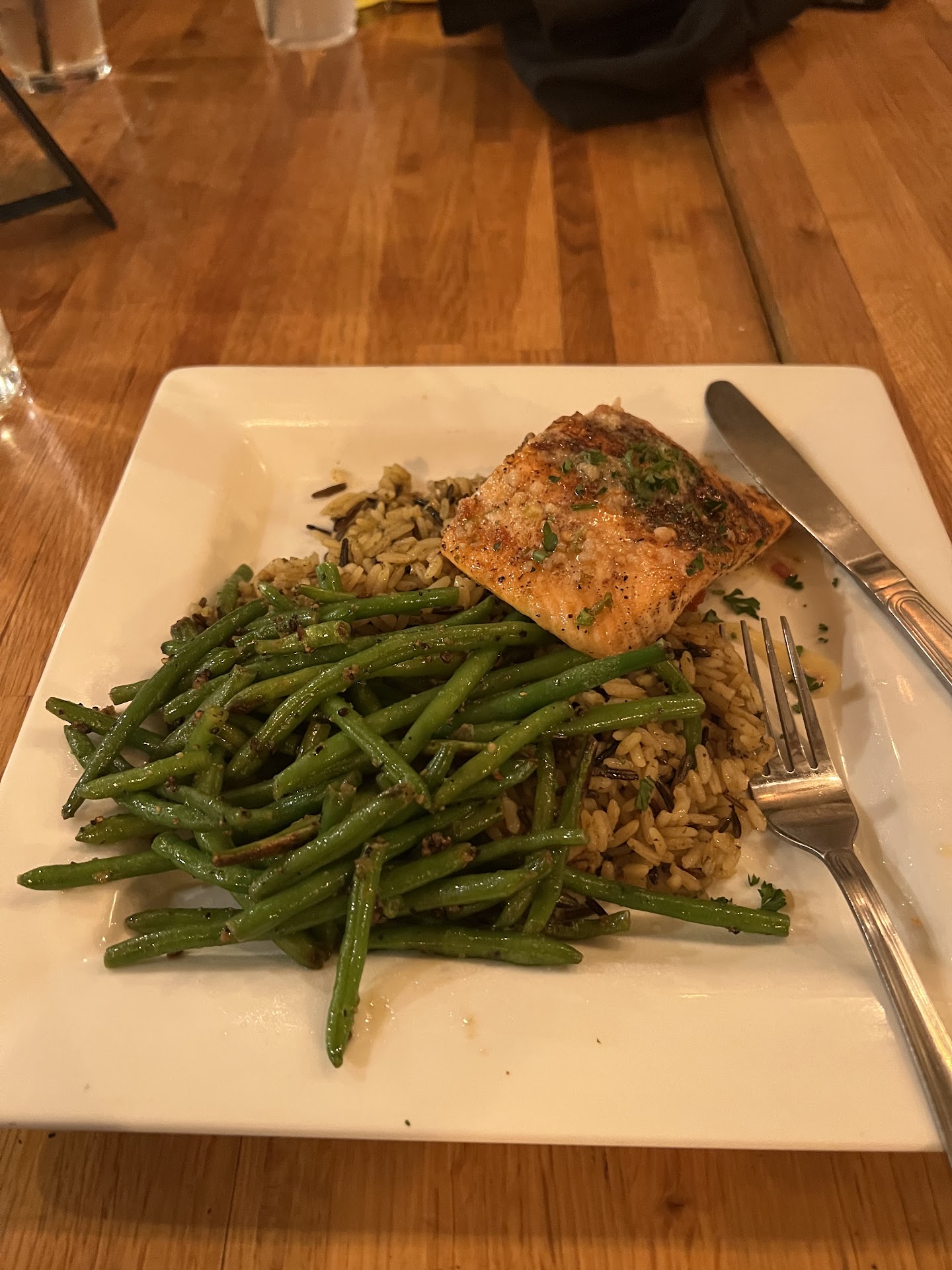 I ordered the salmon and it was pretty good. The menu states it will be cooked medium but it came out dry. The ginger sauce was pretty good, though. I enjoyed the vegetables and rice served alongside. With a few changes, this dish would be great.
