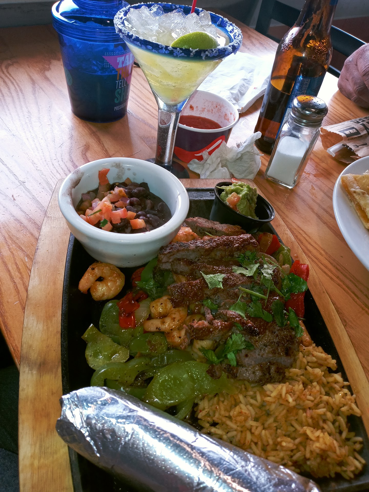 I ordered a margarita with lunch, a small one as I had to drive. The small one was plenty. They serve the margarita in what looks like a martini glass with salt around the rim, and Ice, not blended. I have found that I prefer them this way. It was made with just enough tequila, and served with a shaker so that filled two of the glasses.