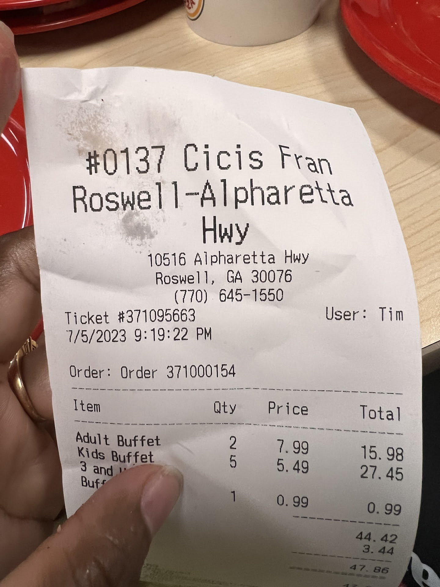 This was my first time here bc my sister in law and kids wanted to go to cicis. I almost drove off because when we pulled up there were 3 homeless people with 1 small cart and a huge and im not being funny but a big big cart with tarp piled hig parked in front ofnthe exit doors. They were in lounge chairs and it threw me off. My sis saif come on lets go for the kids see what its like inside. The cashier we fine it looked ok do we paid and went to gund a table to seat everyone and wash our hands from the park. The bathroom was dirty /nasty and i had to ask for the table to be wiped down and she was super nice about that and even wipednthe chairs.