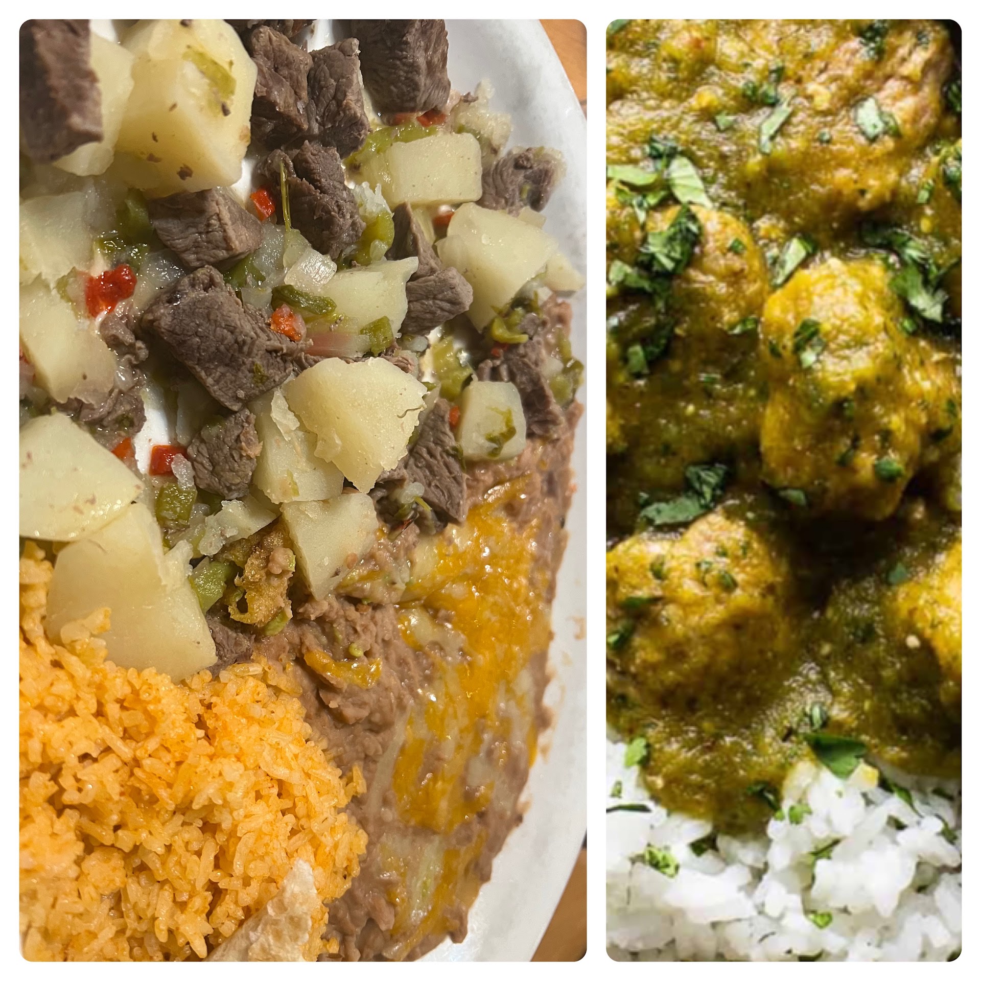 The kiddo had New Mexico style chicken enchiladas with green sauce. The sauce was lovely, the insides were just plain boiled chicken no sauce, no cheese. (I guess that's the difference in new Mexican style enchiladas? Maybe the inside is supposed to be plain, unseasoned meat?) I ordered Chili Verde with potatoes expecting a saucy, porky, potato-y concoction of goodness. I'm posting a pic of what I got. It was not terrible. It was absolutely edible. The meat was super tender. The potatoes were the perfect combination of falling apart but not mushy. There was, however, no sauce.