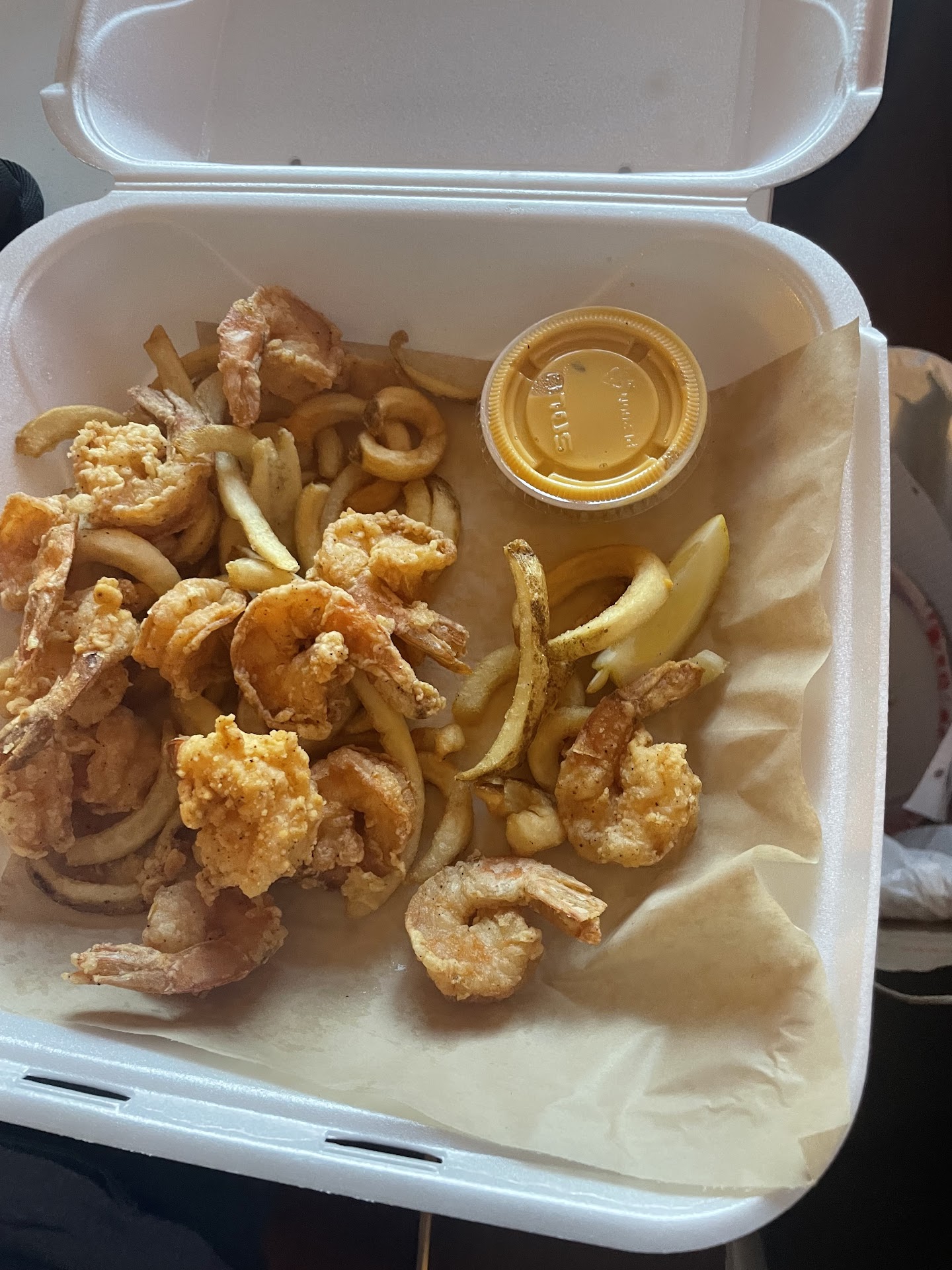 Read moreOrdered on Grubhub The shrimp platter OMG. Shrimp dry and6 pieces of curly fries. Burger platter with waffle fries - 6 pieces of dry waffle fries. If the are going g to make smaller portions they should use smaller containers. My burger was completely scattered around the container. We are stuck at the Ronald McDonald’s house with no car so we rely on takeout on the weekends. -...