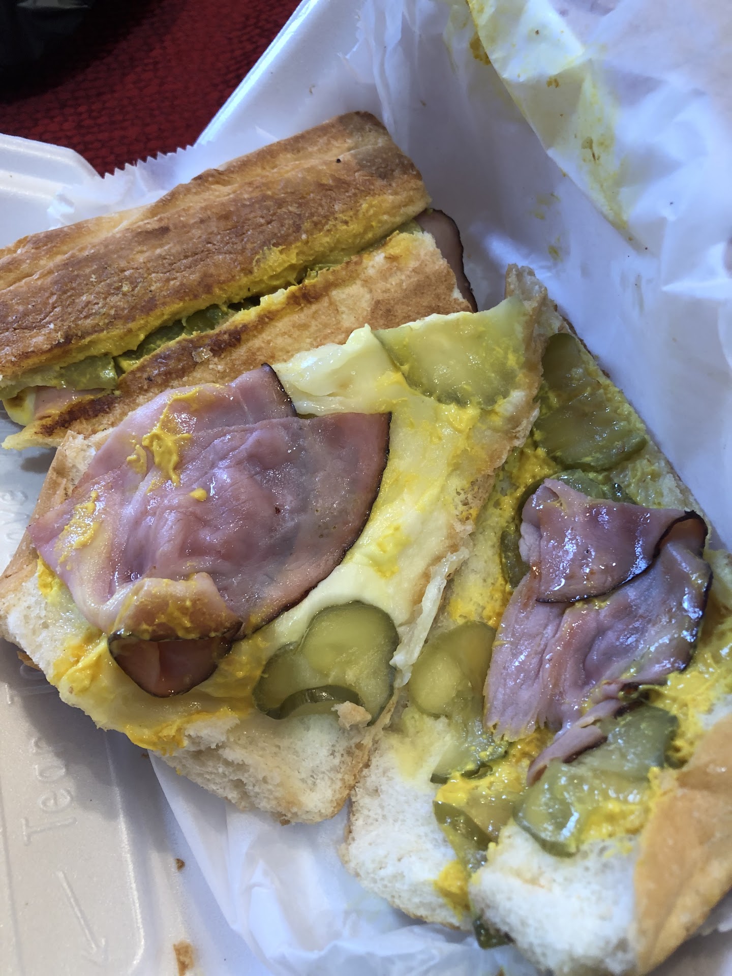 By recommendation, we ordered the steak sandwich and the Spanish sausage sandwich. Both are served on authentic Cuban bread (flown in twice a week.) The steak sandwich is kind of like a meal between buns. Sliced steak topped with grilled onions and shoestring potatoes. Pretty good. The Spanish sandwich was a bit on the salty side for me but still not bad. I have to say, one of the highlights of our meal is the mixed rice. SO GOOD. If you're going authentic all the way, the Cuban sandwich is such a solid, amazing choice. Highly...
