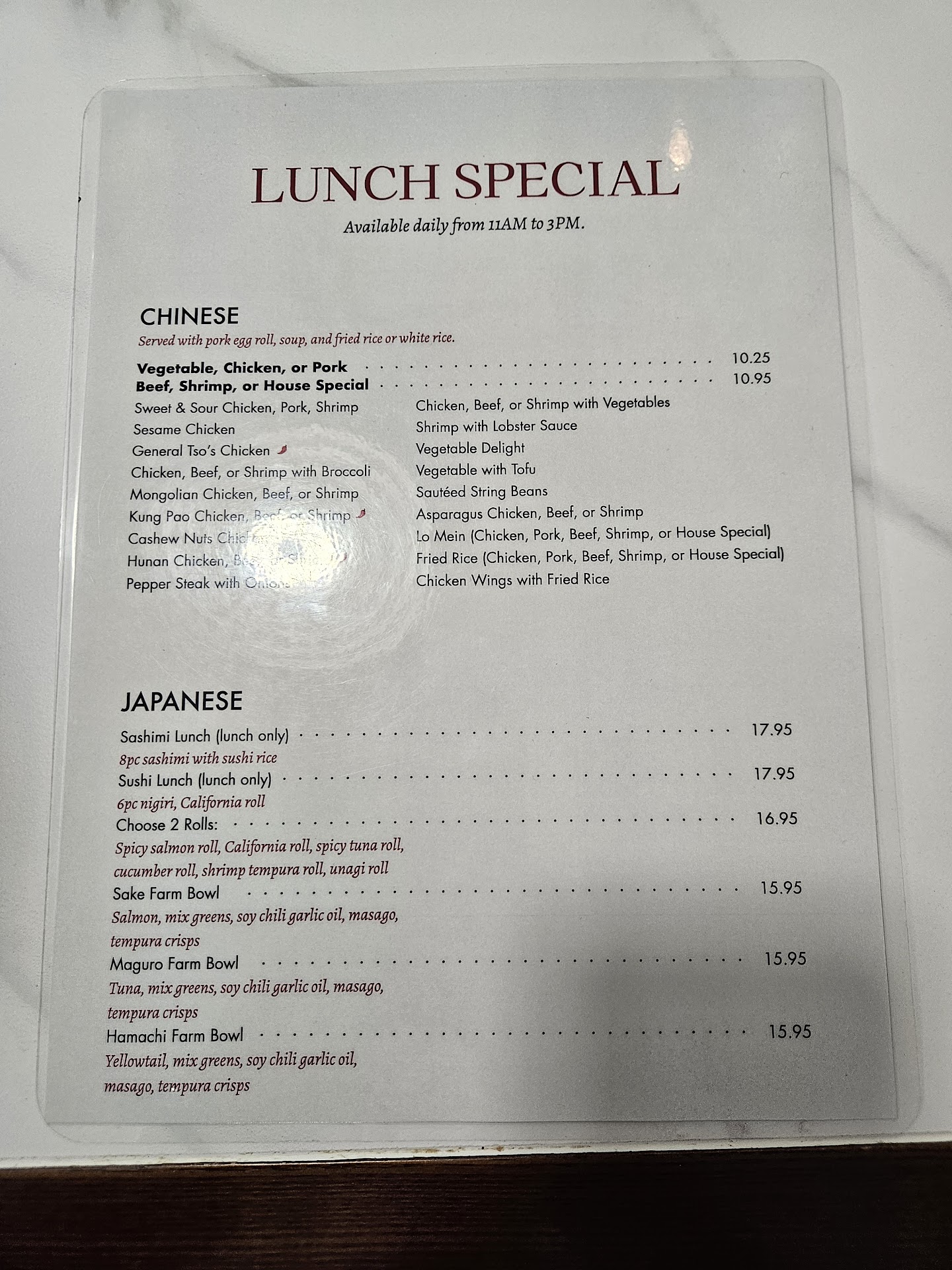 Ā Ā Ā Read moreReally like this addition to the area and like that they have both Sushi and Chinese! I like the food overall - great quality and flavor. The reason I gave 4 stars for the food is only that they don't give very much rice at all - either lunch nor dinner. We ALWAYS have to ask for more rice and Sunday when my husband went by himself, he said that it was barely 1/4 cup - the portions were obviously WAAAAY off. He told the server he need more rice and the server wanted to charge him for it and my husband, who is VERY laid back, pointed out the proportion of rice to entree and they brought more at no charge. I had forgotten to write this review so this reminded me to do so and that they need to give more rice! Heck - it's an Asian restaurant - rice is the staple! :) I understand that you don't want waste, but hey, at least give a normal rice-bowl amount! The reason that I gave 4 starts for the service is that it takes a long time to get your food - no matter if the restaurant is busy or empty. Not sure why - must be short on cooks - but it takes long enough that it's annoying. But again, maybe they just can't hire enough folks like most companies nowadays. But would definitely go here - just tell them you want a full...