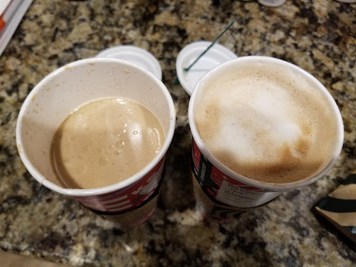 Read moreYears ago I gave this store 5 stars. They have fallen so very far! They dont even deserve a half star! They are ALWAYS behind, especially between 7-8 am. They constantly make mistakes with the order, omitting customizations or # of espresso shots. When they make a mistake, they act as if the customer is deliberately making their lives more difficult. Today, they made a huge omission, and once again I had to wait for them to even START making my mobile order. There was only 1 customer in the store! I didn't even get an apology! They have completely forgotten what the Starbucks standard for service and hospitality is! Order at your own risk! This is my latte vs my daughter's (from a separate order). Why is 1/4 of mine...