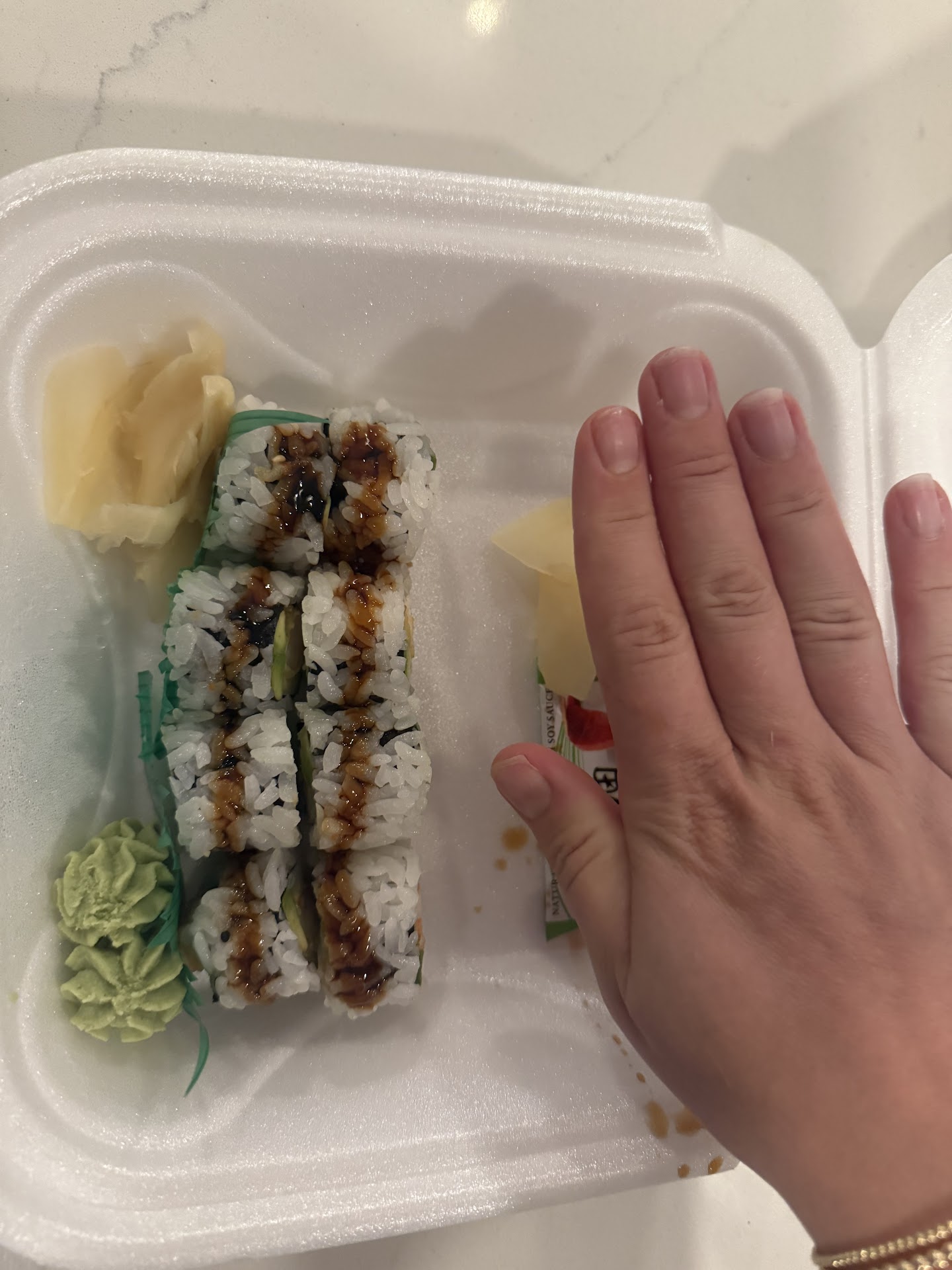 Read moreOrder uber eats from here. I only leave a review if I had a good experience, I don’t like to mess with peoples businesses and opinions are subjective. But let me tell you the objective side. Three goyza came in our order, the fried jalapeño roll had only three pieces and the shrimp tempura roll was laughably small. I’m not sure how they cut it so small. I’ve included a photo. For reference I’m 4’11” and have tiny hands, please note the size of the role next to the wasabi dollops. $14 for the shrimp tempura roll and honestly it was like 4 regular pieces in size. I feel so ripped off because their photos don’t represent what you actually get. Also the shrimp was so small like you can’t taste anything when the roll is that small. Nothing tasted bad, it was more of a rip off. $14 for shrimp tempura roll, $5 for three little goyza and $16 for three pieces of the j bomb roll when the photo has four pieces and does not represent what they had online. Like I said see...