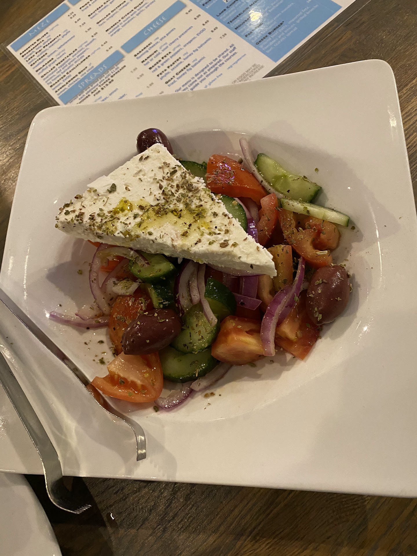 Read moreWe were seated promptly at the time of our reservation. The server took drink orders. I guess the bar was busy, because my friend's wine arrived after the appetizers and iced tea. I asked the server to describe the Spanokopita meze. He said it comes with three triangles, but "I can give you four or five," so I chose four. The people who ordered soup enjoyed the very generous servings; the verdict on the dolmades was "pass" next time, not very good. Server brought several orders of mini gyros. One order was incorrect and had to be sent back. It took a very long time for the new order to arrive. The chicken gyro was dry. Two people each asked for more taziki. They received one small ramekin to share and had to ask for a second. The grilled vegetable plate was generous and tasty, but lacked color, as everything was brown. The filling of the Spanokopita was acceptable, but overpowered by the overcooked phyllo dough with burnt points that left a burnt aftertaste. I didn't send it back as I didn't want to be late for the theater. I mentioned that to the manager who, at the very end of our meal, brought some roasted red pepper to the table (that had been left off the veggie plate), and the cavalier reply was that now the red pepper would fix that burnt taste. On top of that the extra small triangle the server "gave" me was a 25% upcharge. When the server cleared the table, he left the knife that he dropped on the floor right below where one guest was seated and could easily have tripped on when arising, and even when he came back and forth with the checks, he never retrieved it. What makes or breaks a good meal? It's all in...