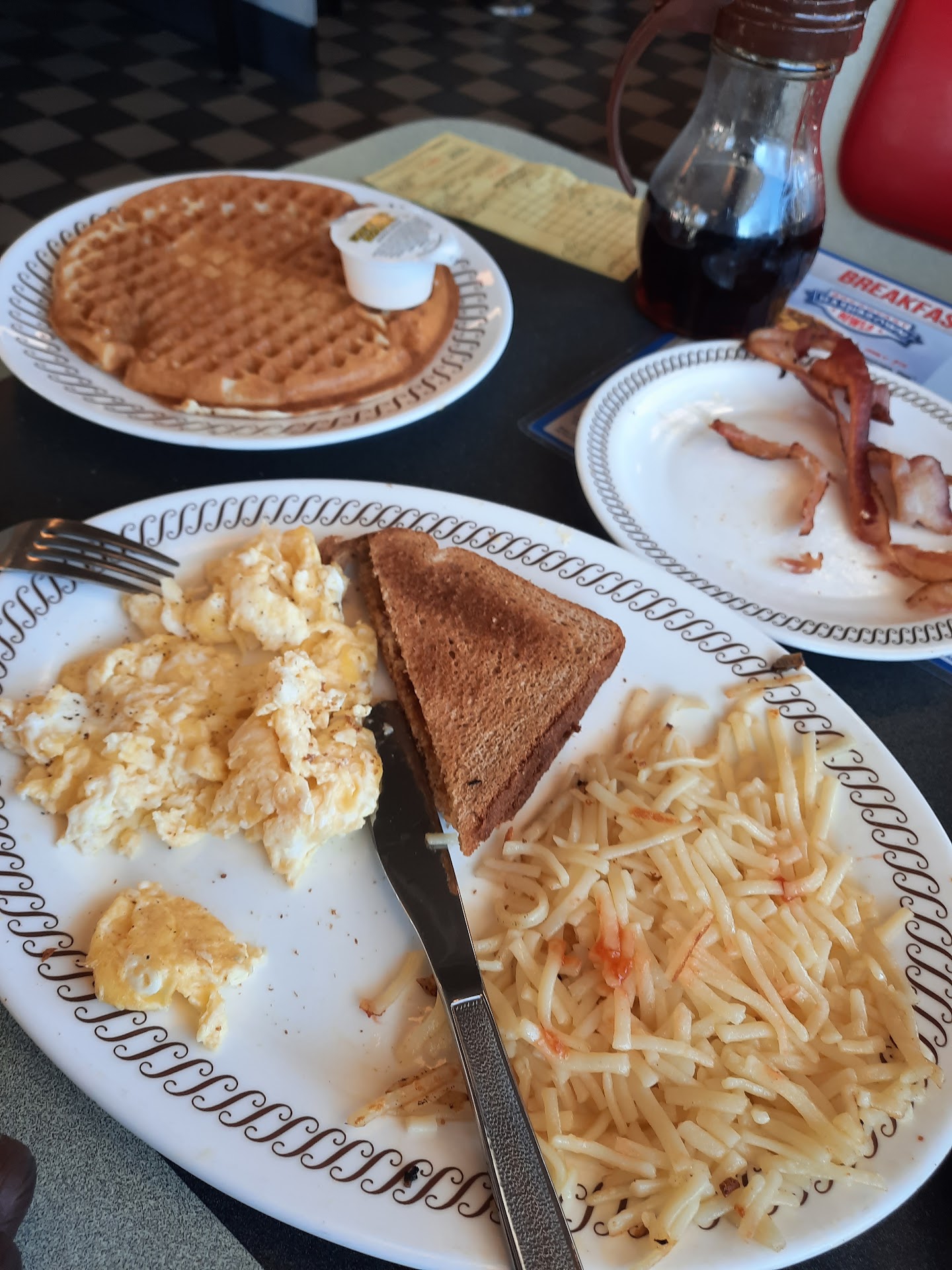 So, I went to this Waffle House soon after to see what would happen. I arrived about 12 minutes later and verified the server and cook via phone with my colleague. I went in and stood where he sat and waited. And waited. And waited. I was not acknowledged by the same server for 5 minutes and 18 seconds. There was now a lovely couple and no one else in the establishment. The server walked right pass me a few times and did not utter a word to me. He went to wipe tables that were already clean. When the cook was done cooking the food for the couple, she turned to me and said "Hi. What do you need?" She was nice. I told her that I only needed to see how long it would take the server to acknowledge me - of which he never did. Sucks for him because I usually tip 100% at Waffle House. She was cool - love a person who has blue hair. 🤩