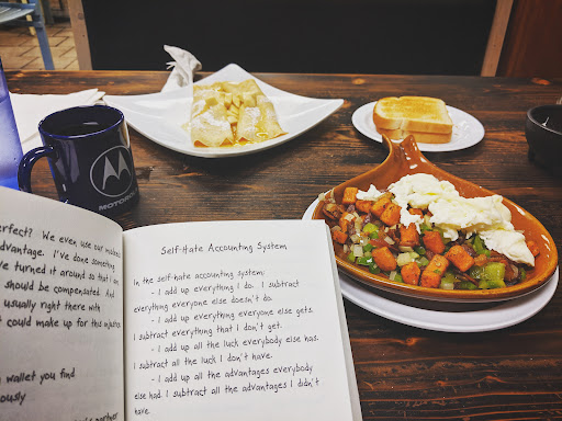Read moreWe really wanted to like this place. Unfortunately, the only good thing was the toast. I am giving them 2 stars for the fast service and for getting a large order correct. My husband had the biscuits and gravy, he didn’t get into specifics but said that he didn’t like them. The pancakes were rubbery, you know the kind you need a serrated knife to cut? Pancakes should have just a slight crisp on the outside, even the taste of these was just off. The bacon, although good size pieces, was entirely too greasy. As if they cooked it in an inch of grease and never bothered to strain or pat some of the grease off. Bacon should be greasy but not sopping. The potato pancakes were burnt, too thin, and tasted like they may have come from a box. I couldn’t take more than 3 bites, I tried. It was nice that they provided both apple sauce and sour cream. The regular hash browns were literally just grated (probably Idaho) potatoes cooked. Zero seasoning or flavor, although some salt, pepper, and ketchup made them taste just fine. The omelette was similar, bland. No flavor. My husband didn’t even eat more than a few bites of his eggs. They did have these fantastic fried potatoes, although a bit greasy, they were seasoned well and tasty. We also ordered the Breakfast burrito and I’m still trying to figure out how they could make chorizo and what I think was some sort of salsa on the side bland. I just don’t get it. Overall, we will not be ordering food from them again. The prices were fair, in my opinion for portion size, but we ended up throwing most of the food out...