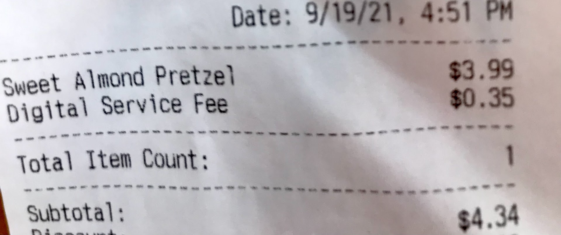 What the heck! The company is passing on their expense to you. You as a customer has to pay for using their mobile app fees ( digital fees). I did not know this until I looked at my receipt. Auntie Ann charge me $.35. On top of that, at 4:45 PM they don’t Make fresh pretzels anymore so the pretzels are HARD because it stay in the warmer for over 2 hours or more . My pretzel was hard, and I am not happy.