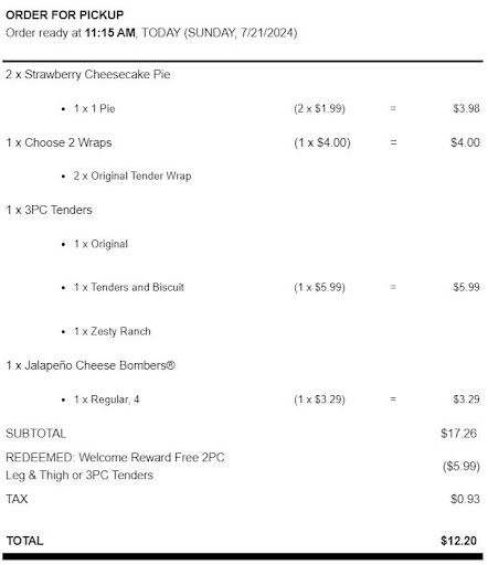 Ā Ā Ā Read moreOrdered online for pick up at 11:15AM today. Two pies, two wraps, 4 piece jalapeno bites and a three piece tender with a biscuit.