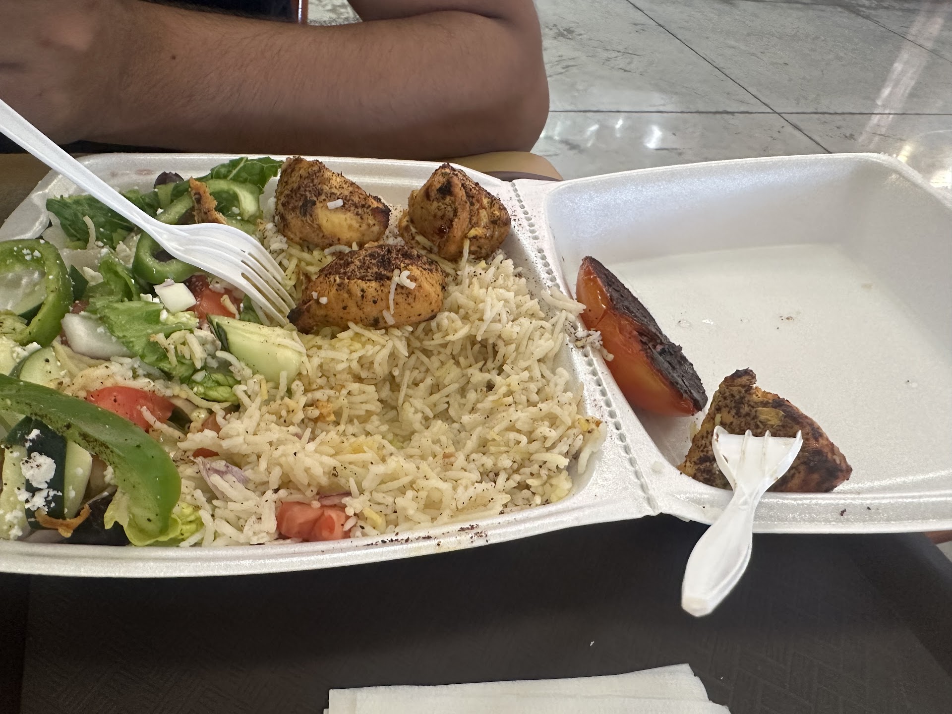 Read moreOrdered chicken kebab , that came with vegetable and kebab chicken and some tomato. Chicken was over tenderized with some chemicals not tasty at all .. vegetable are blund no taste. Rice was over spiced with cloves and taste clove rice instead of fragmented rice. Wasted 25$ for one item and 2 bottles of drinks. Never order again and see what I got in the photo attached....