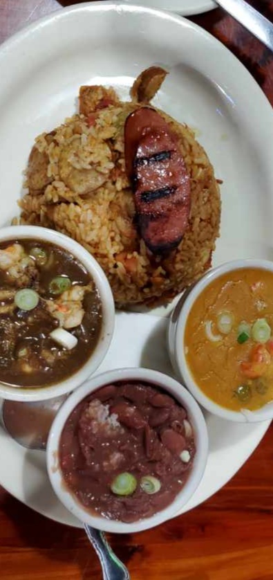 Gumbo, very soupy, Iāve made gumbo and Iāve had gumbo in Louisiana. Flavor was good, but also not a ton of meat. A small portion along with the red beans and rice on my plate. Basically I paid over $20 for rice, a tiny cup of soup (not gumbo) and a tiny cup of beans and rice.