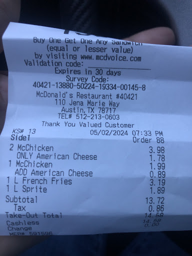 Read moreNice, new interior, very convenient location to go to after school or soccer games/practices, but instead I will drive to other nearby McDonalds or choose one of the other fast food options. They constantly get our order wrong, forget things, give us quarter pounders plain with nothing on them, the patties are tiny, thin and tasteless. I have sat in the drive-thru line for 20 minutes before and the only reason I didn’t leave or go inside is because I had two young children strapped into car seats. They have given us all our food, forgetting the drinks, and then disappeared from the window. Tonight, I could hear the workers laughing and cackling in the background when I ordered my food, and they messed up the order again. I parked, unbuckled my kids, and went inside to show them the burger, and then had to sit and wait while I watched the staff stand around and laugh and joke with each other. The second burger was somehow worse than the first plain one. This is the worst McDonalds location and after many, many chances, we are finally done for good. I will not be going back, and corporate needs to look at all of these...