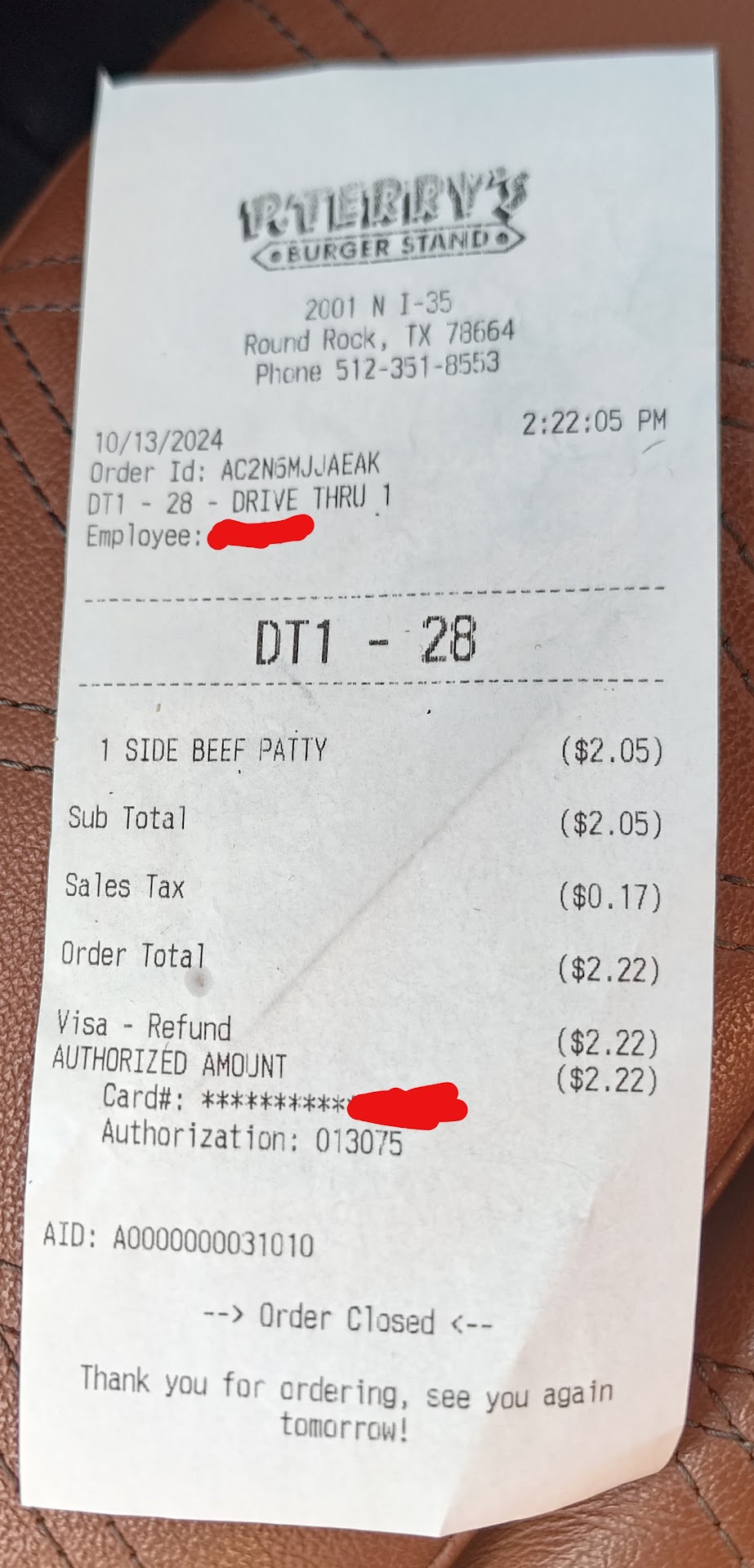 Their crew is green, obvs, they once forgot my fries, both of them, but I came back the next night when they weren't totally slammed and they fixed it, even with a different crew. I bet they'd do the same for everyone else who misses speedy tacos so much they're gonna trash talk the brand new P.Terry's. Btw their veggie burger is like almost as good as greenhouse, which is almost as good as hopdoddys IMO, and that once was the other way around, before Todd left.