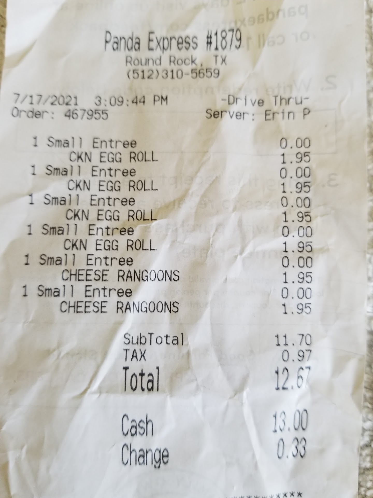 Read moreI ordered food through the drive through approximately a week ago and was over charged by $3.00. I checked my bank statement the following day(that’s when I noticed I was over charged) for a very small portion of food. I immediately called the store. I explained the issue to the Supervisor ( she said she was at that point in time). I asked for her name, unfortunately I forgot her name. She told me that she cannot do refunds unless I have the receipt, which I had already discarded the receipt earlier on that day. She took my name and number, apologized and told me that I was able to get a free plate the next time I come to Panda Express. Today 02/12/2021, I had an appointment in Round Rock so I stopped by Panda Express. Ms Fenty approached me, when I explained the situation to her, she immediately had a disgusting attitude and wouldn’t give me time to explain myself, nor was she trying to understand what I was saying. My husband then Stepped into the conversation and explained to her that we didn’t come here for free food, we came here because y’all over charged my card. I would never spend another dollar at this restaurant again and I wouldn’t recommend...