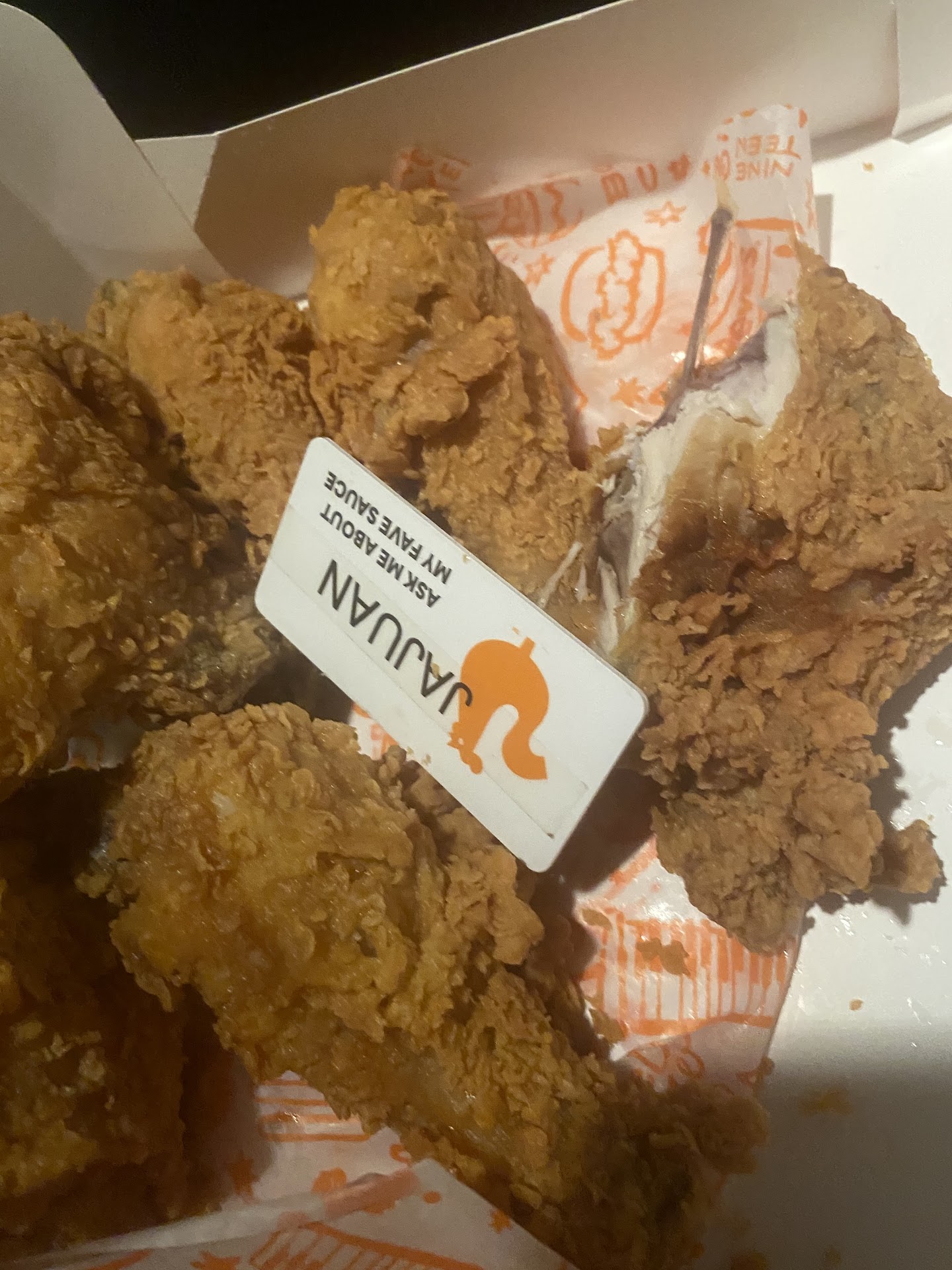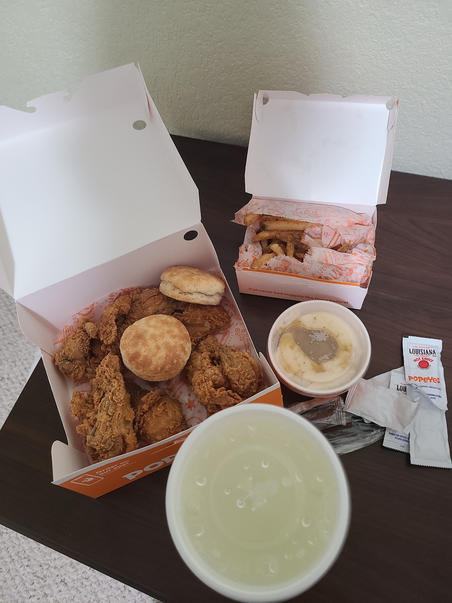 Read moreI craved chicken today so I chose Popeyes university blvd near my house and ordered thru app ahead. I went there around 8:40pm and the manager said something about my order but I didn't hear what she said and I AKSED AGAIN: "Are you guys preparing my order" and she said YES. Then I was waiting for literally 20 mins, the store was not busy and I thought they lack of staff making online order (since I used to work at fast food restaurant, so I understand the system), so I waited in patiently. Until 9:05pm, I asked them again, but they ignored me first, then I asked a Spanish girl, but she can't speak English. Then the manager came to me and said someone took my order and they dont have responsibility to make my order again and ability to refund and don't know how to use cancellation on the app. I said how could they took my order because it makes no sense unless the staff did wrong thing and they should be responsible for it. The order is under my name (Myar) and my name is kinda unique and I don't have any relatives or friends here. Also, I've already paid for it and I asked them how can I get my money back. The manager raised her voice and keep denying what I said and asked and I feel like it is my fault. All they replied me is DON'T KNOW with disrespectful and unsupported responses. I really wanted to cry because it's my first meal in a day after a long tired day. Then I went to the 1008 IH-35 location and they welcomed me warmful and served so fast. They're out some in my order, but i'm willing to change it because they're very nice to me. I feel console a lil bit and I think I will never be in the University Blvd store anymore, I'd rather drive further and bit and receive what I paid for. The picture is what I ordered and picked up at the Popeys...