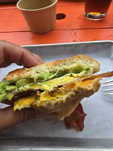 Food is great.. limited menu, but just enough in my opinion.. once we got our food, we were missing a taco and a side of avocado.. the missing taco was from the very first person in our group to order so I don't know how it was missed.. went ahead and ordered it, paid for it, plus another taco for good luck đ.. second, order of side of avocado for the breakfast sandwich was missing.. it was quickly taken care of.. and the tacos we ordered were delivered to us outside.. I'm very particular with my eggs, and the over easy egg I ordered on my breakfast sandwich was more like over well.. (see pic)