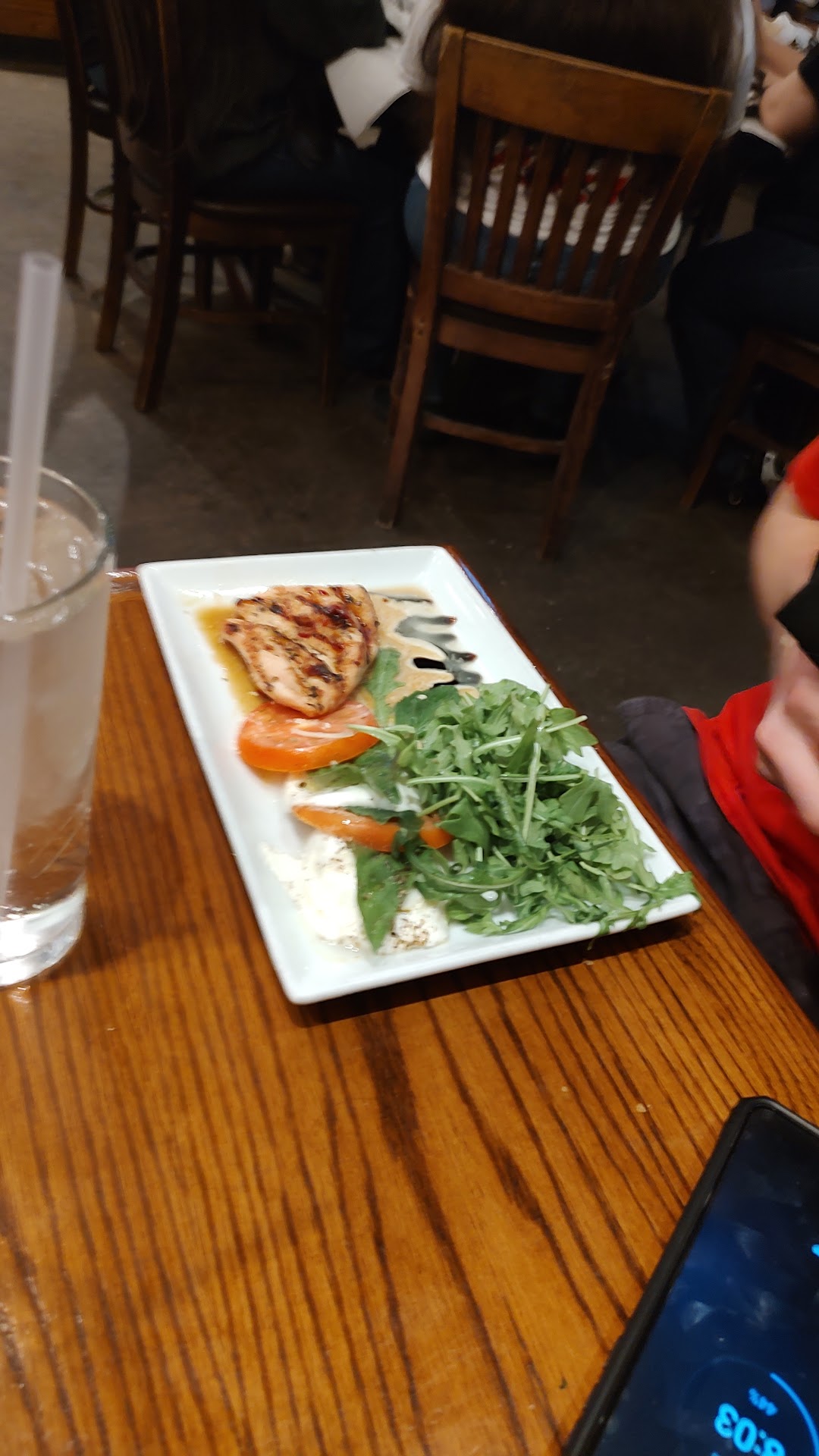 We order drinks ( tea sand soda) and then order calamari, bruschetta, and 5 entrees ( my son wanted the chicken caprese salad along with his meal. The server brought us bread and olive oil and about an hour in the calamari showed up. 15 minutes later the caprese salad.