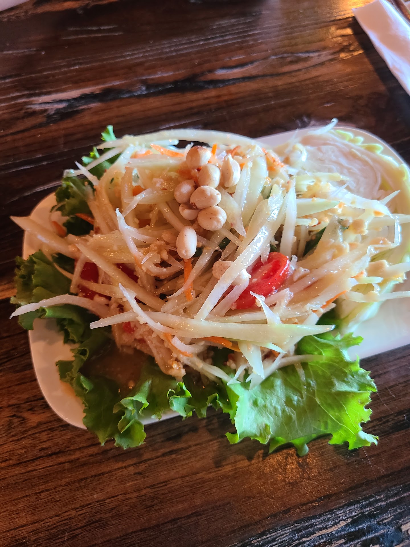 Best dish tasted was the papaya salad! It had peanuts, string beans?, green papaya, cherry tomatos, and a slice of cabbage on a single leaf of green leaf lettuce. Packed with fish sauce flavor. Just a tinge of heat. Definitely ask for thai chilis if you want more heat. They only have powdered thai chilies and pickled jalapeĂąos though FYI. (~$9)
