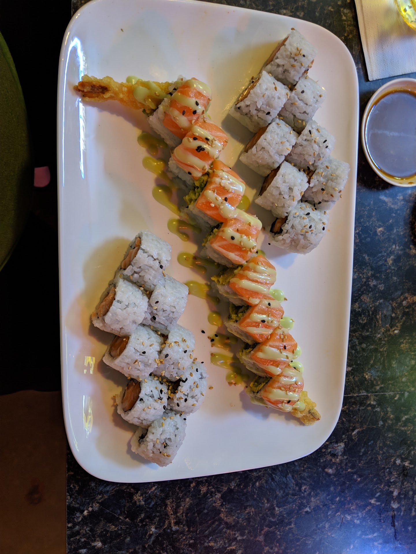 Other staff also checked on me in between my busy, yet perfectly attentive, server doing the same. The crab stick appetizer was delicious, the two sushi rolls I ordered, the VIP and the volcano were soo delicious, fresh, saucy and just as described! đ