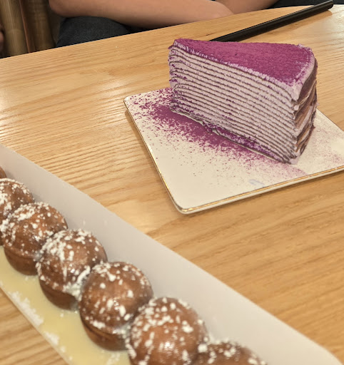 I was really excited to finally get here because the interior, deserts looked so good and delicious in reviews so I needed to give a try. The inside looks absolutely stunning and they also have enough area for you to take nice pictures. I ordered matcha Mille crepe and it was soft, yummy and not super sweet which I loved. We also wanted to get some coffee or tea but here comes "but"..... It was our first time and we WANTED to buy and try the drinks, we aren't picky but since we are not familiar - we had questions. The way the stuff helped us out was bad. The guy was on the phone while we were walking toward him and got back to that straight after not being able to suggest us any drinks after we asked about teas and coffee jelly. No questions of "what do you usually drink/do you like sweeter or less sweet/ strong or less strong drink", no suggestions - n.o.t.h.i.n.g. if there was a line behind us, I'd understand the lack of interest but it was just us. That whole interaction dropped my excitement to the place to almost zero so to sum up Great for one time experience - can't say that it is worth coming back. I do hope, it gets better because it has almost...