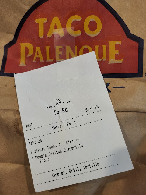 Review: Tuesday, August 23, 2022 (Dinner To Go) JP chose takeout from Taco Palenque. A beef fajita quesadilla, and 4 street tacos, and it came with "dynamite" charro beans. Everything was well seasoned. The only reason I give them 4 ⭐️⭐️⭐️⭐️, is because the sirloin for the street tacos was a little dry, but the portion size was very satisfying. We didn't finish. Excellent charro beans, and beef fajita quesadilla!👍👍Ooh wee cheesy...