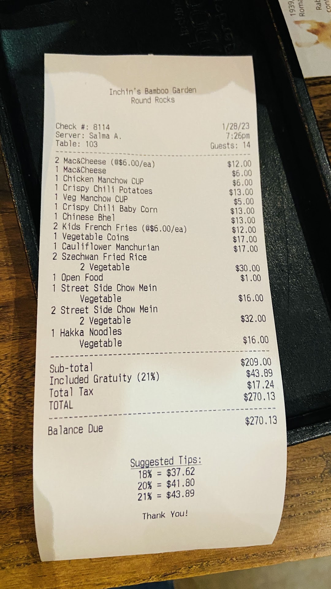 Reducing from 5 stars to 1 star! We went there on a Friday Night and there were hardly 5 people in the restaurant. We should have caught a hint right there. But Oh Boy! I have been to Inchin's in Bay Area and Washington DC and even the Austin one, but by far this experience was the worst! Their Fried Chilli Paneer, a starter i always order had exactly 6 pieces of Paneer slices. Inchin's is known for its Quantity and Quality. 6 slices for 12.99? ARE YOU KIDDING ME! When i asked them about why they reduced the quantity, the person who was serving our table replied, it has always been 6 pieces- you are wrong! Rule of Thumb for any business- YOUR CUSTOMER IS NEVER WRONG. And you can explain it politely. We are paying for the food that we are getting from you. You do not give us our food for free! The service was horrible. We had to flag down the server to refill our water every single time! The food was cold but was tasty! Hence, one star. On a Friday night, one of the employees working there (I assume she was an employee) decided to bring in her family for dinner, Nothing wrong with that. But she walked in and out of the kitchen multiple times also with left over food from their table back into the kitchen. If she was working that night, i would have no issues. But If she is not, it is alarming to see a person with casual clothes and unsanitary hands with her hair not covered walk in and out of the kitchen! Does this management always allow random people into their kitchen? Ever heard of HYGIENE?