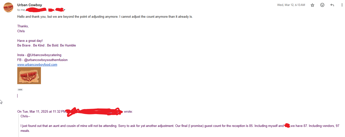 Regrettably, I have to leave Urban Cowboy with a bit of a mixed review for my wedding. edit: response was pretty unprofessional ngl so also take that into account.