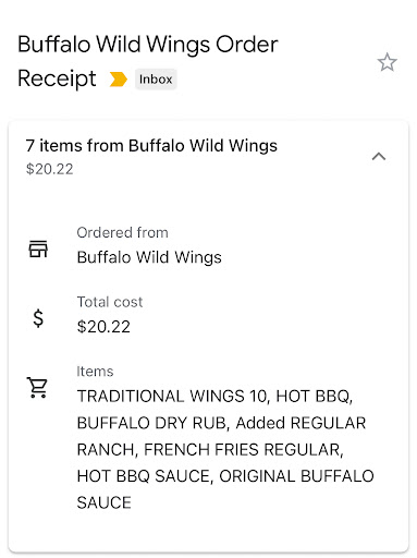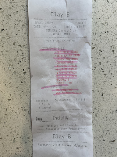 FOOD: I picked up a boneless 20 peice and the chicken was rubbery like it had been frozen, cooked, cooled off, then put back in a fryer or high temp oven. They splashed a little sauce on each piece of chicken - to use up what was left over in that sauce bowl is what it looked like bc not one piece was fully covered in sauce. But honestly, not even sauce could have saved this chicken. Maybe after your cook plates or boxes the food, the person who bags it should do a QUALITY CHECK...just a suggestion.