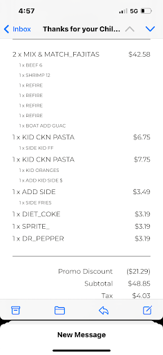 -beer was frosty and my cocktail was fabulous. Maybe one of the tastiest cocktails Iāve ever had. I really, really enjoyed it. I think it was the captainās castaway. 5/5 -we tried the southwest eggrolls. These were good- if you saw GMM, these beat Applebeeās appetizer (the wonton tacos) and I donāt think they should have, BUT we really liked these and I would definitely order them again 5/5 -my husband ordered a large fajita platter to share with our little one. It was hot, fresh, and tasty. They both enjoyed it 5/5 -I ordered a steak with garlic mash and asparagus. The sides were tasty, but the steak was grey and not a great texture. It looked well done and Iād ordered it medium-rare, so I asked the kitchen to remake it. The second steak was a little better, but I realized that the lighting in the restaurant was so awkward that when I took my leftovers home, it was perfectly cooked in my kitchen lighting (albeit still very grey). Steaks tend to turn a grey color when theyāre steamed to speed up the cooking process or when theyāre cooked on too low of a temperature. Please be sure to sear on high to get the best color and flavor of your meat! Brown food tastes good. I wouldnāt order a steak from Chiliās again- it costs the same amount at Texas Road House and I think we all know TRH wins on every level. 1/5 -I am pretty sure we ordered dessert, but I donāt even remember what it was so it must not have been memorable 3/5
