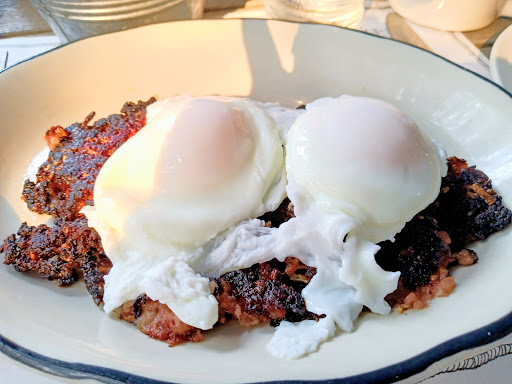 This is one of the breakfast spots in our rotation, and there's a lot to love about it. Today we got the mid America (pork and eggs,) the eggs Benedict, and the hot house omelette (Italian sausage, cheese, and salsa.) It was packed there, and it took about 15 minutes to get a seat (quicker than expected for the amount of people waiting) we sat in this back area that we hadn't sat in before. It was cozy the tables were well spaced out and it's a very colonial vibe. The mid America was nice the pork was unseasoned and unsalted, but well fried. The baked apples that came with it went really well with the pork. I ordered fried eggs over medium with it, no complaints there. Lastly the home fries were pretty average, but I don't find the standard for home fries to be that high in the area. Unseasoned, but not under fried. Also I got a biscuit as a side and it was very fluffy, not dry and it came with whipped butter. Very nice. Next was the eggs Benedict. I've had others that are better in the area, I believe the ham is a bit to blame because that is what really brings it flavor, it's a nice cut, just could be a little thicker. The hollandaise I think is above average, delicate and buttery. It complimented the egg nicely. The hot house omelette (from the specials board) was really nice, plenty of egg in the omelette, the sausage set the stage, the jack cheese was a perfect choice for this omelette, and had a nice stringiness to it, and the salsa really pulled it all together in an unexpected but welcome way. Also we got a side of strawberry pancakes with it which is what they do best. The pancakes are a cut above the rest, very fluffy and not too dense. The potato pancakes with apples is my favorite, but the strawberry pancakes are sure to be loved by all. We all shared a side of bacon which was delicious and not too pricey. Our waitress was attentive and never let the coffee mug empty. When the check came we had to pay cash (we know the deal,) but it's a little inconvenient though better than paying a higher price (not that we don't get hit with a service fee from the in-house ATM but that's neither here nor there.) I wish this place had more options things like muffins and specialty items (chicken and biscuits or something) as we're running out of things to order there and there's not necessarily a stand out thing besides the pancakes which I get is the focus of the restaurant, but it would be enough to make me recommend it to more people. Overall we're not going to stop coming here the food is good, and the service is quick and attentive but I wish I was more excited about ordering...