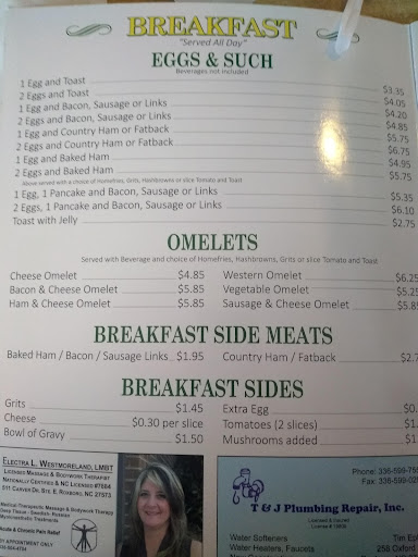 Great place to eat any meal! Been eating there it seems forever. Used to take my Grandsons there in Saturday mornings when both were in grad school. Now the oldest - Wyatt 21 graduates from college next month. The youngest will be in 2nd year College in the fall. Anyway Tina, the owner always remembers her regulars favorites and you'll never have an empty coffee cup. Tina always makes customers feel at home and you get to eat off of plates with silver no paper and plastic. Even though the place is always busy at regular meal times with full anything breakfast items and daily delicious lunch and dinner specials you won't wait long if at all. Oh, and for John Deere affectionate, Tina is "Wacky" over JD ANYTHING! Bring her something and she will be happy to display it. This is an old fashion good place to eat, and you are just about guaranteed to meet a neighbor or see someone you know sitting at a table next to you or nearby. You know it's a good place to eat, when Roxboro and Persons finest and bravest, as well as NC State Highway Patrol eat there! They always know where they get the best and the most for their money! Try it, you'll love it, but don't tell anyone or you'll ruin one of the best kept secrets in the county!...