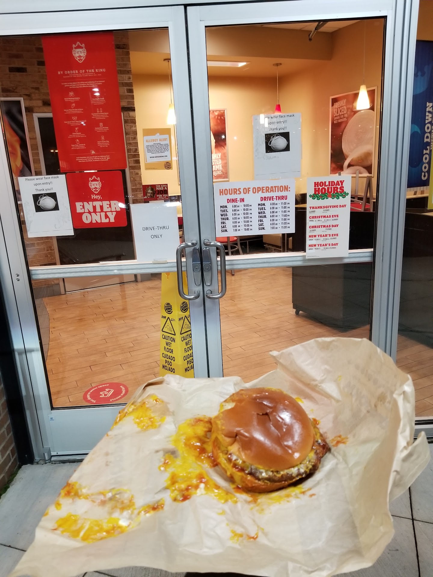 Tonight, we placed the same order plus 4 cookies. We were given the whoppers and cookies and 3 drinks, not the requested two. All the clerk needed to do was take back one drink and refund the money. The Dr. Pepper wasn't marked so nobody could tell which drink to return. The clerk took all 3 drinks back then returned all 3 with ice. Again, no refund. No straws. No napkins.